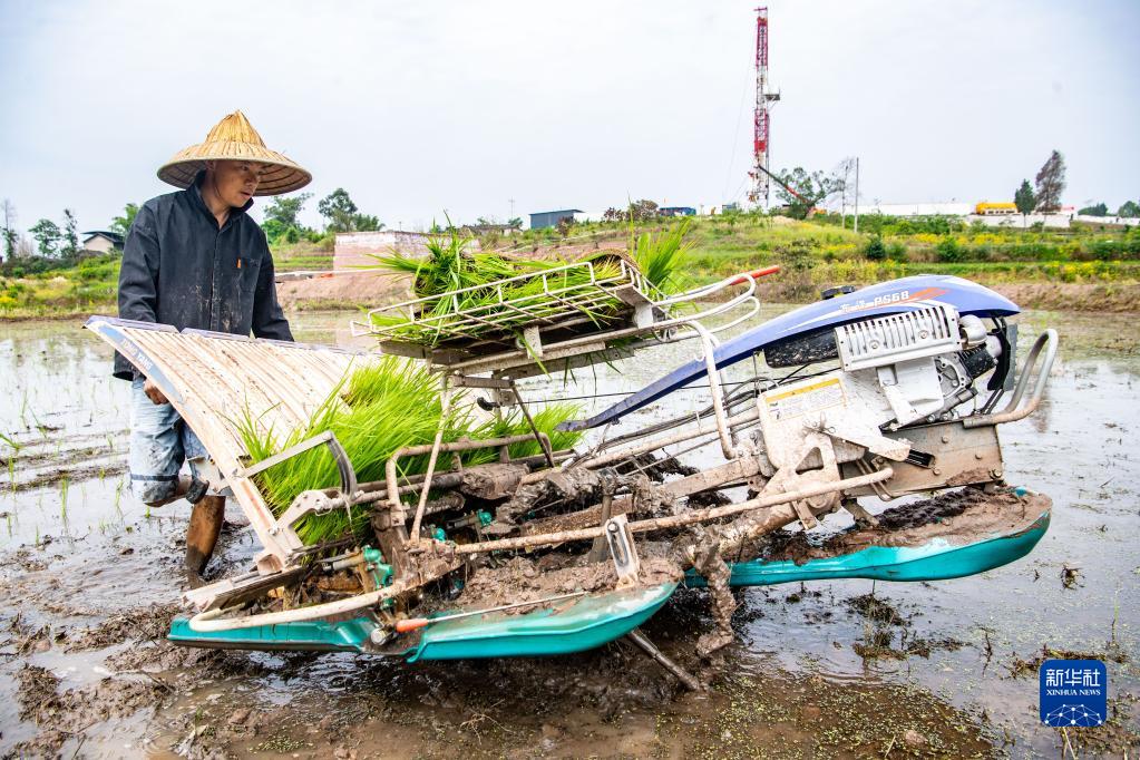 5月4日,在重庆市合川区大石街道龙骨村,农民操作农机插秧。 目前,地处重庆西北部、被誉为“巴渝粮仓”的重庆市合川区粮食耕种进入冲刺阶段。稻农们忙碌在田间,通过直播、机插秧、人工移栽等方式,抢抓农时,播种插秧。 “巴渝粮仓”合川区,粮食总产量连续多年位居重庆市首位。 新华社记者 唐奕 摄