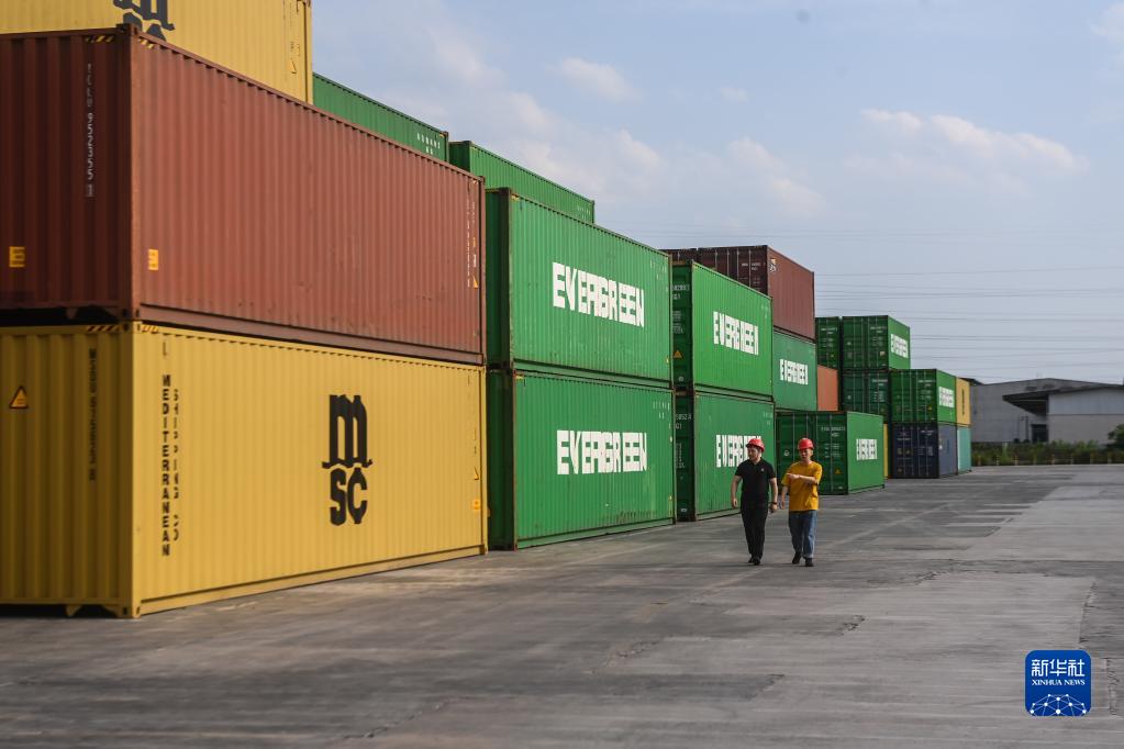 5月4日,诸暨市财政部门工作人员(左)到海铁联运中心查看外贸货物运输情况。 从2023年初开始,浙江省诸暨市财政局坚持“科学生财、创新聚财、精明理财、高效用财、勤廉管财”五财并举要求,聚焦稳外贸、稳外资工作重点,探索财政政策、制度、资金的综合集成,主要通过外资外贸奖补资金支持开拓国际市场、支持特色产业抱团参展、支持内外贸一体化建设、支持畅通国际物流服务等举措引领诸暨更高水平开放发展。今年以来,诸暨已累计兑现外资外贸奖补资金7322.45万元。 新华社记者 徐昱 摄