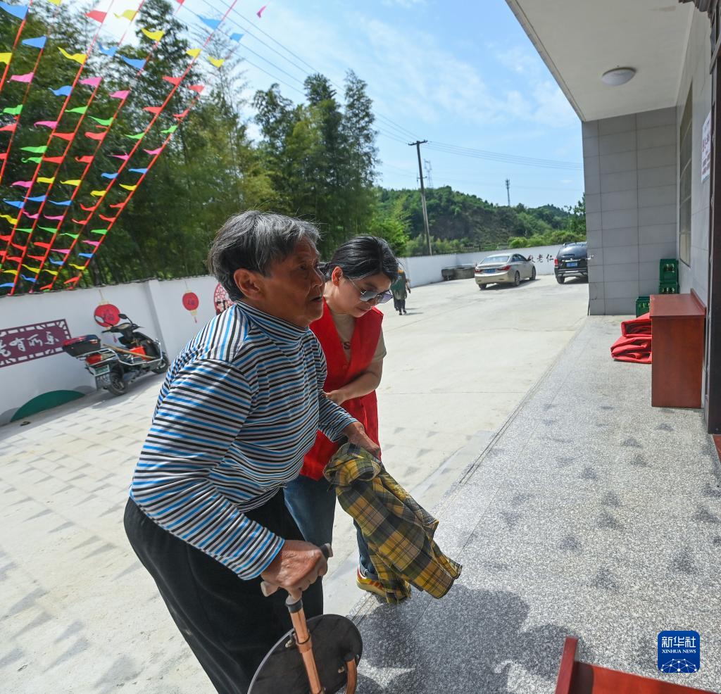5月4日,老人来到东白湖镇湖山村爱心食堂就餐。 近日,浙江省诸暨市东白湖镇湖山村爱心食堂正式投入使用,这是东白湖镇成立的第18家村级爱心食堂。近年来,东白湖镇开展营养餐定制、志愿者送餐、便民服务进家门等多样化服务,将乡村爱心食堂打造成服务民生新纽带、文明实践新阵地,托起“暖心饭碗”,让乡村老年人在家门口吃出“幸福味”。 新华社记者 徐昱 摄