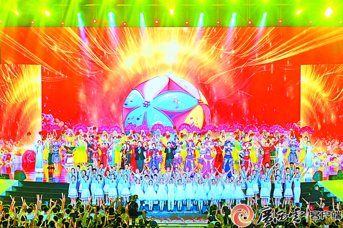 5月21日晚,“壮族三月三·八桂嘉年华”暨第24届南宁国际民歌艺术节闭幕式“大地飞歌·2023”在南宁举行。记者 徐天保 何学俏 摄 5月21日晚,“壮族三月三·八桂嘉年华”暨第24届南宁国际民歌艺术节闭幕式“大地飞歌·2023”在广西体育中心体育馆精彩上演,将于5月22日通过电视、广播、网络等平台播出。今年民歌节与“三月三”进行创新融合,主题更突出,内容更丰富,形式更新潮,更展民歌风采,更具国际风范,更显时尚风韵,全力打造一场思想精深、艺术精湛、内容精美、效果精彩的文化艺术盛宴。 今年是全面贯彻党的二十大精神的开局之年,是落实习近平总书记对广西“五个更大”重要要求、全面建设新时代壮美广西的起步之年。在全党上下持续掀起学习贯彻习近平新时代中国特色社会主义思想主题教育热潮之际,自治区党委、自治区人民政府主办的“壮族三月三·八桂嘉年华”文化旅游品牌活动热烈开展,成为展现民族文化魅力、推动经济社会发展、促进民族团结进步的盛会。 “大地飞歌·2023”是南宁与国际衔接的文化平台,是展示南宁经济与社会发展腾飞的文化窗口,也是搭建南宁加快建设面向东盟开放合作的国际化大都市的文化桥梁。“大地飞歌·2023”汇聚了国内外优秀表演团体、艺术家,以及新民歌挑战赛等活动中的获奖选手,以歌会友,以歌传情,讴歌伟大新时代,唱响幸福新生活,搭建民族文化交融、中外文明互鉴的舞台。从极富山林韵味的“上林高腔”到灵动活泼的天琴弹奏,从国家级非物质文化遗产项目“彝族跳菜”到民族跨界流行的优秀原创作品《对歌对到日落坡》,从充满中国风情的《家园》到印尼等6个国家的民歌,从爆火全网的木棉组合《呗侬情深》到励志鼓舞的唐艺《熠熠的光》,从额尔古纳乐队的草原天籁《我在这里等你》,到2022《中国好声音》年度总冠军梁玉莹饱含故土深情的《飘雪》,将民族文化以时尚方式表达,打造更具关注度、时代感的艺术精品,展现了广西灿烂的历史文化、多彩的民族艺术和动人的民歌魅力,唱出了全区干部群众凝心聚力奋进新征程的勇毅豪迈,给为期一个月的“壮族三月三·八桂嘉年华”文化旅游品牌活动划上圆满句号。 东盟国家驻邕领事机构代表,道德模范、劳动模范、民族团结进步模范代表,首府各界干部群众代表,以及来自全国各地民歌艺术家们共3600余人欢聚一堂,共襄盛会。 壮乡欢歌 余音绕梁 ——“壮族三月三·八桂嘉年华”暨第24届南宁国际民歌艺术节闭幕式“大地飞歌·2023”掠影 《大地飞歌》的旋律再度响起,“好日子,歌里过”的祝福点燃激情。5月21日晚,“壮族三月三·八桂嘉年华”暨第24届南宁国际民歌艺术节闭幕式“大地飞歌·2023”在南宁举行。