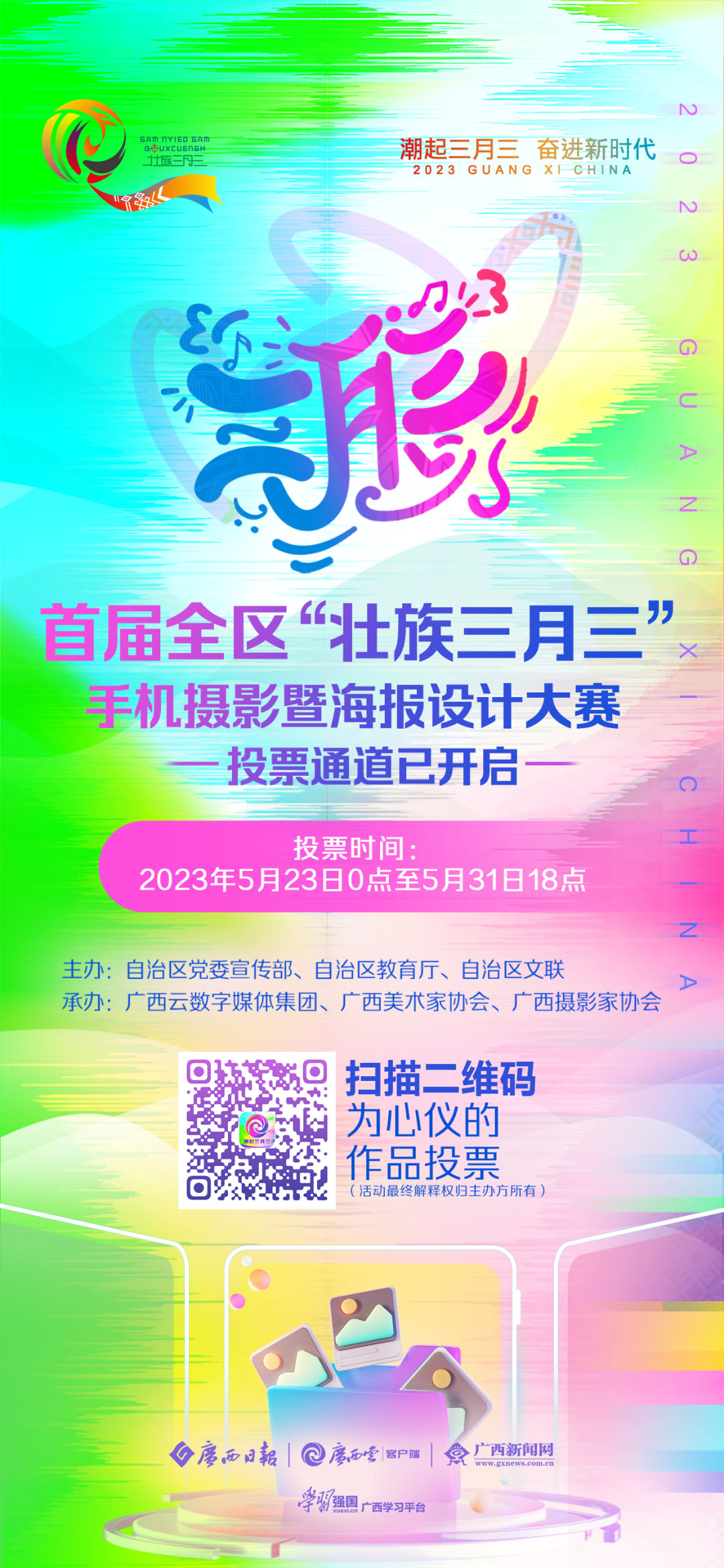 首届全区“壮族三月三” 手机摄影暨海报设计大赛 作品投稿阶段目前已圆满结束 我们收到了许多别具一格的精美作品 经初步筛选 对符合要求的入围作品进行网络投票 线上投票通道已在 5月23日0时开启 快来pick你最喜欢的作品 识别下方海报二维码 投下你宝贵的一票! 识别海报二维码进行投票↑↑ 投票细则 1.线上投票时间 5月23日0点起至5月31日18点截止。 2.投票细则: (1)网友投票(占40%):每人每个ID每天可以投10票,次日可继续投票; (2)专家评审(占60%):由广西云数字媒体集团有限公司组织专家进行评审。 3.获奖作品将在广西云客户端等平台进行展示。 活动最终解释权归广西云数字媒体集团有限公司所有。 点击下图进入广西云客户端: 2023年“壮族三月三·八桂嘉年华” “视窗”式大专题 悦赏更多内容 ↓↓↓ |