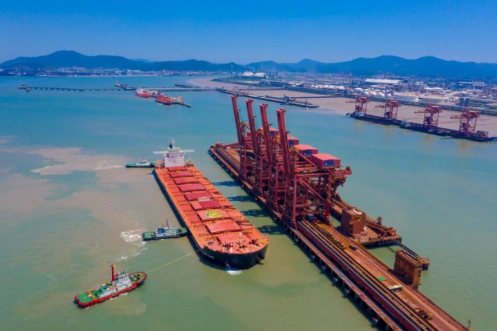 图为宁波舟山港北仑港区矿石中转码头靠船场景。