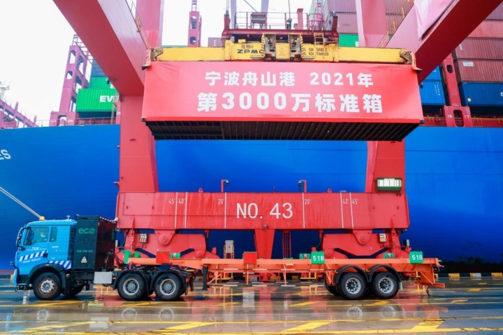 图为2021年宁波舟山港集装箱吞吐量首超3000万箱起吊仪式。