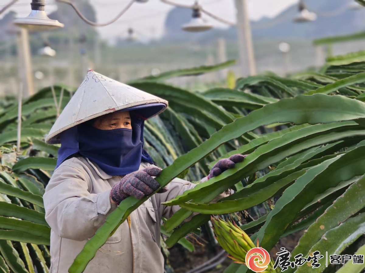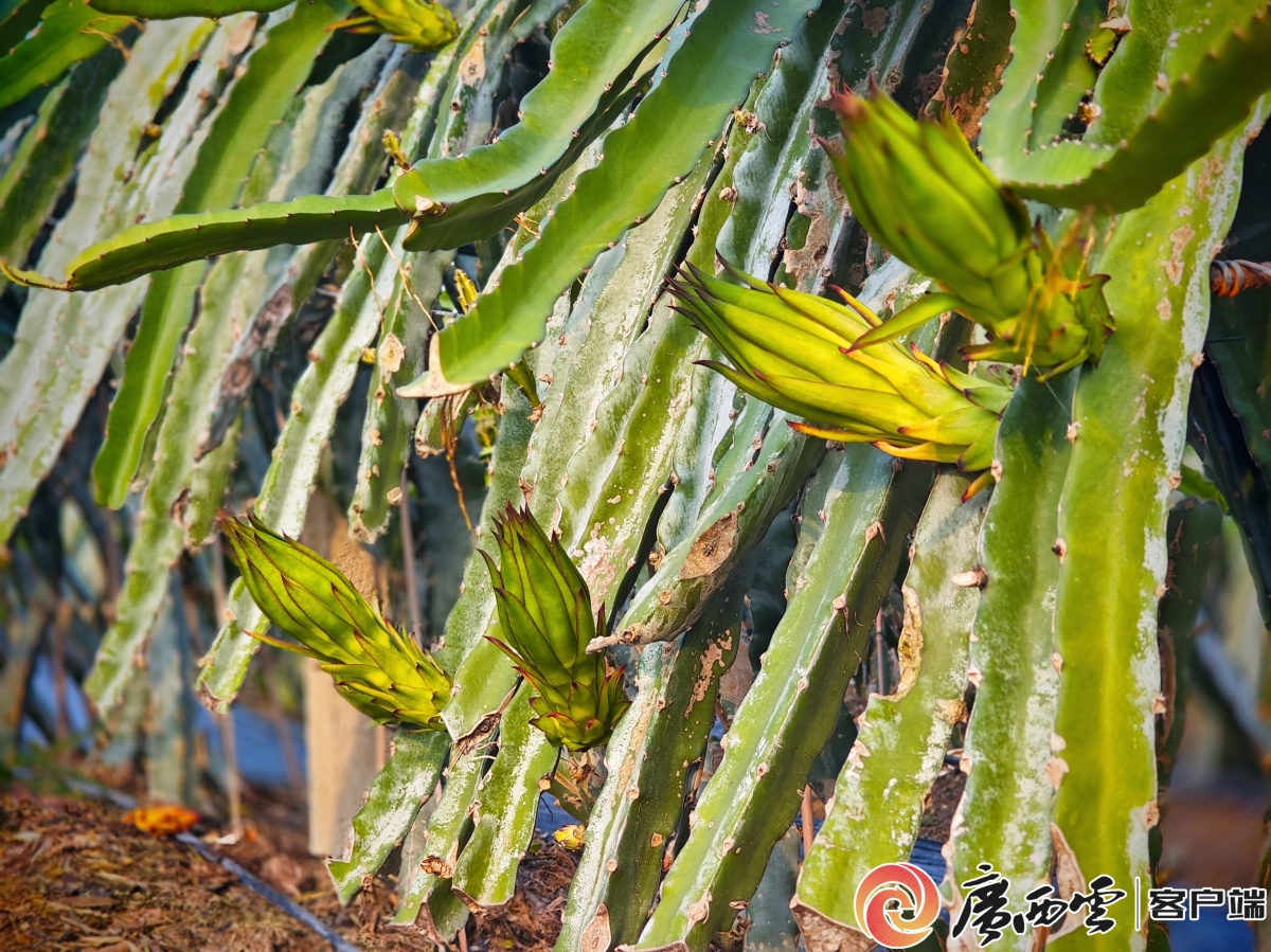 走进隆安县金穗火龙果产业核心示范区基地,近万亩连片的火龙果树的树枝上缀满了花蕾,农户穿行在田垄间为一根根绿藤压枝、疏果。更值得关注的是,基地里整齐铺设先进水肥一体化滴灌设施和补光灯光补给系统,科技加持下统一标准化种植是火龙果品质提升的要方。