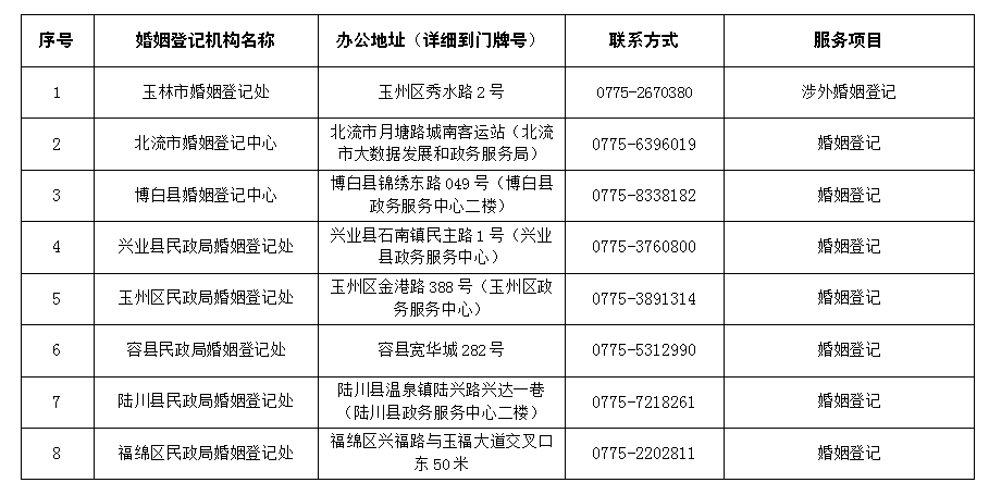玉林各县(市、区)婚姻登记处联系方式。 “我们不提倡群众扎堆领证,但是针对群众的需求,我们全力做好服务工作,满足群众的需求。”玉林市民政局工作人员介绍,为了解决群众办理婚姻登记“多地跑”“多次跑”的难题,广西婚姻登记已经在2022年10月实行“全区通办”,广西居民可持双方身份证,户口本到任何一个婚姻登记机关办理。从今年6月1日起,我市落地实施婚姻登记“跨省通办”,可持双方身份证户口本和一方居住暂住证到所在地办理。 |