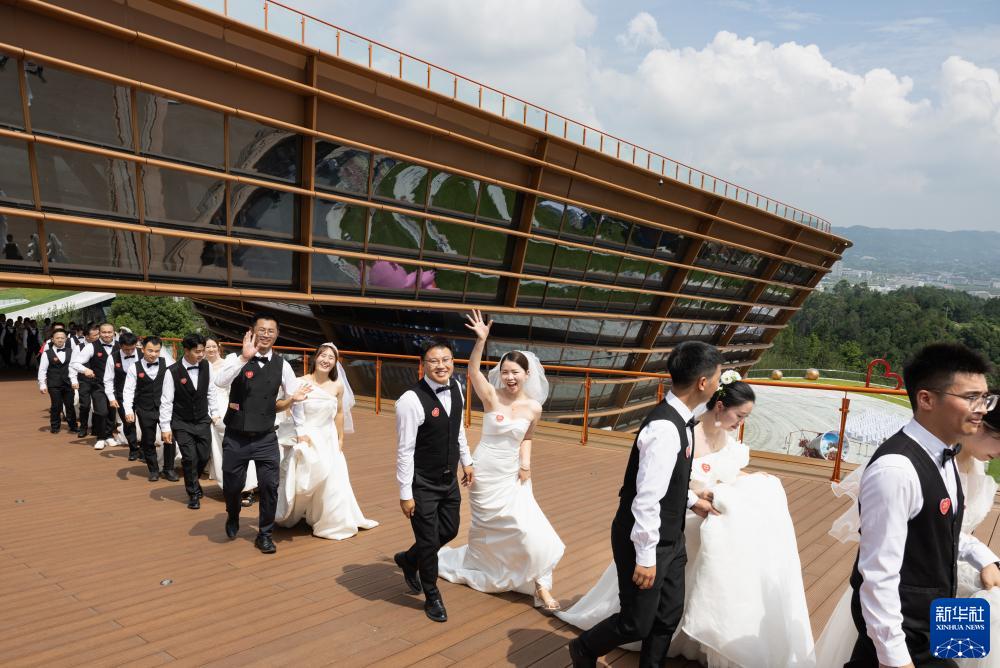 8月22日,新人列队来到三江新区“三江之眼”。 当日是七夕,来自四川省宜宾市三江新区33对新人在三江新区“三江之眼”举办了“为爱奔赴·幸福三江”主题集体婚礼。 新华社记者 江宏景 摄