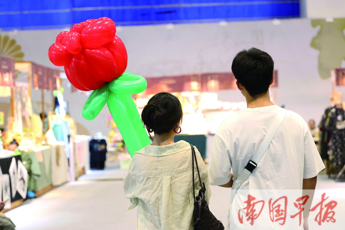 8月22日,一对情侣抱着巨型气球玫瑰逛集市。