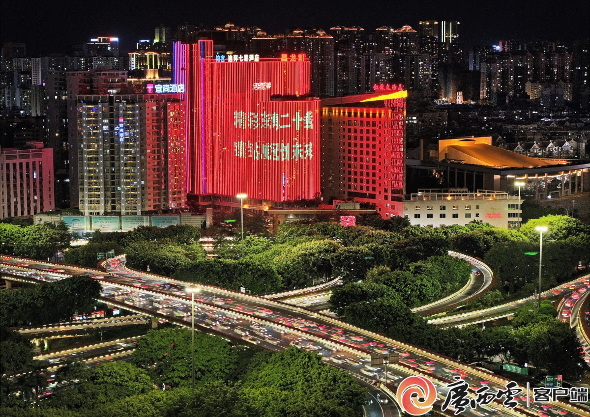 连日来,每到夜幕降临,华灯初上,首府邕江两岸、五象新区、民族大道沿线、朝阳片区等区域标志性楼宇建筑纷纷“亮灯”。绚丽多彩的灯光如梦似幻,如烟如霞,如闪闪的繁星点缀夜的衣裳;飘扬的旗帜、川流不息的车辆交相辉映,尽显南宁无限活力;四通八达的城市格局,独具匠心的楼宇亮化设计,为参会的八方来客、四海宾朋好友奉上一场美轮美奂的灯光视觉艺术盛宴,更展现了壮乡人民对“东博会和峰会”的热切期盼和对与东盟各国深化合作的殷殷期盼。