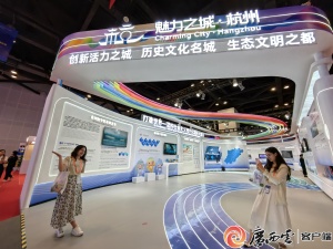 中国“魅力之城”杭州市展厅集中展示亚运会、数字经济、三大世界遗址等特色内容。记者 徐天保 周军 何学俏 摄