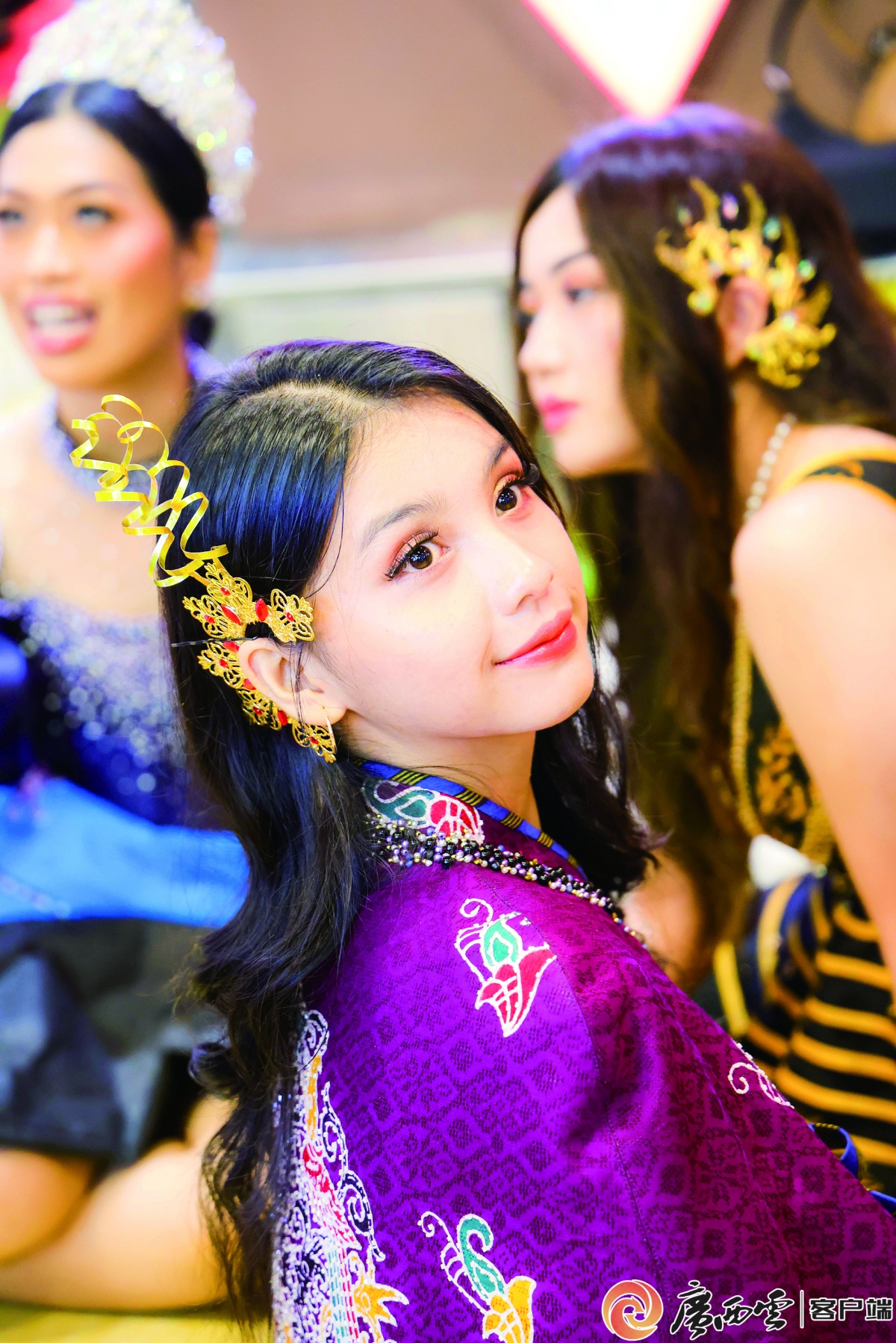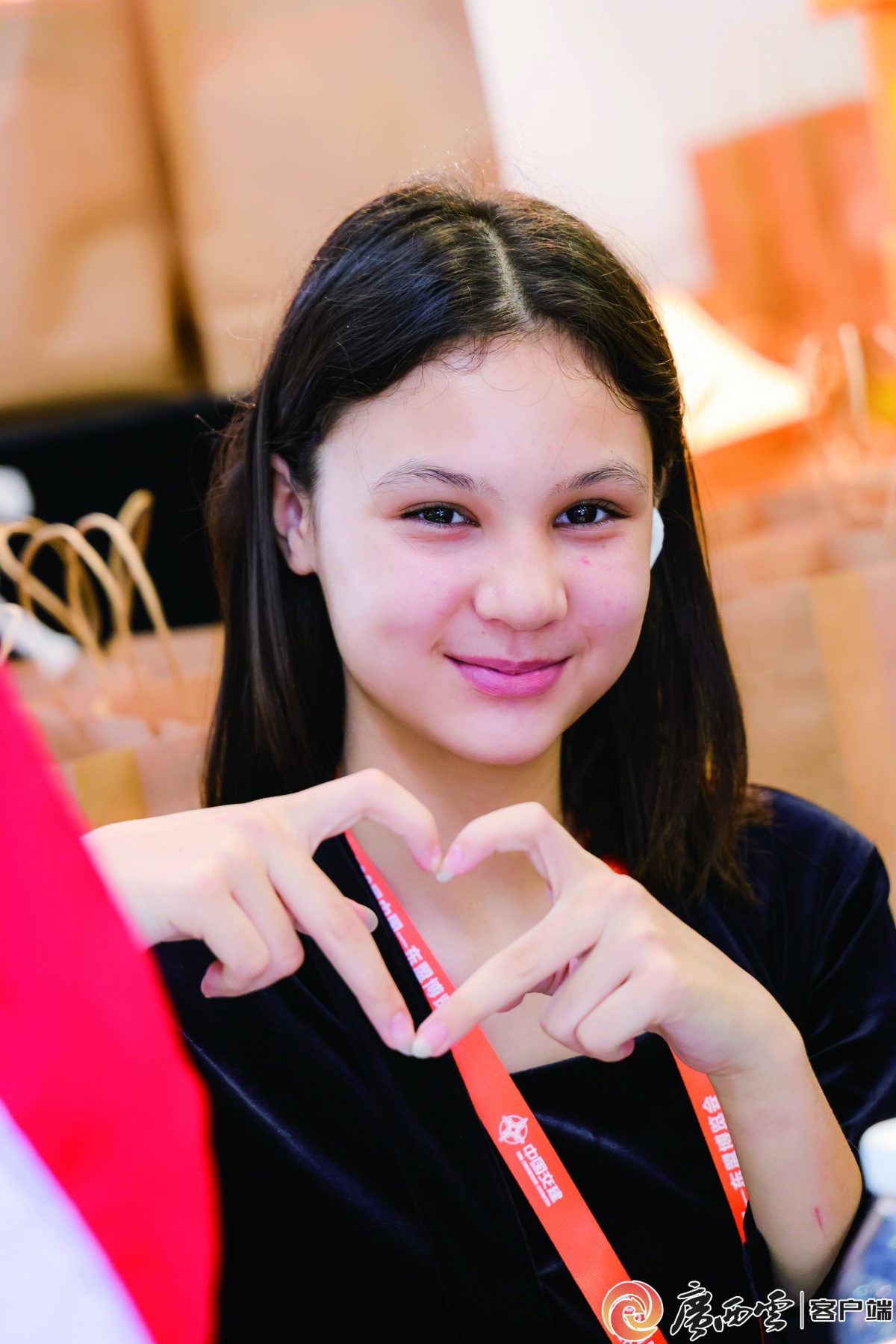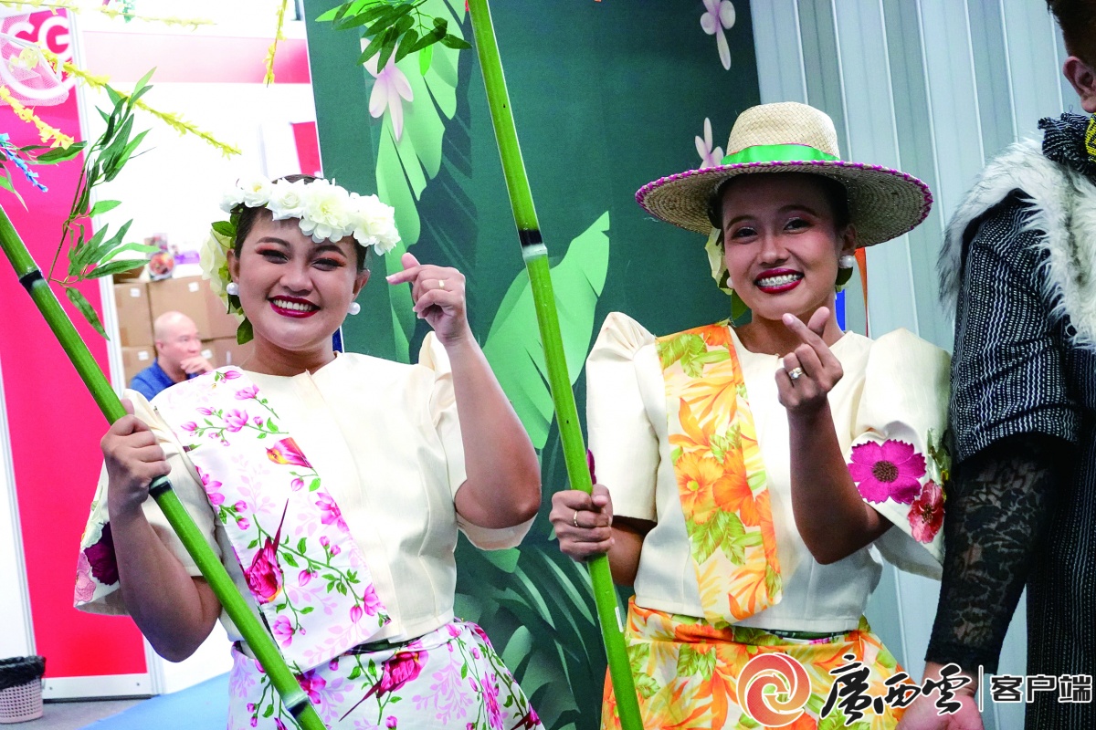 菲律宾展区的表演者笑着“比心”。南国早报-广西云客户端记者 邹财麟 游拥军 何定坚 苏华 摄