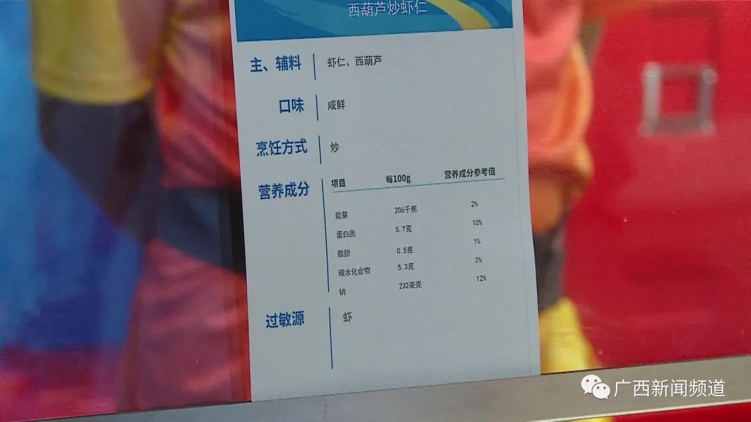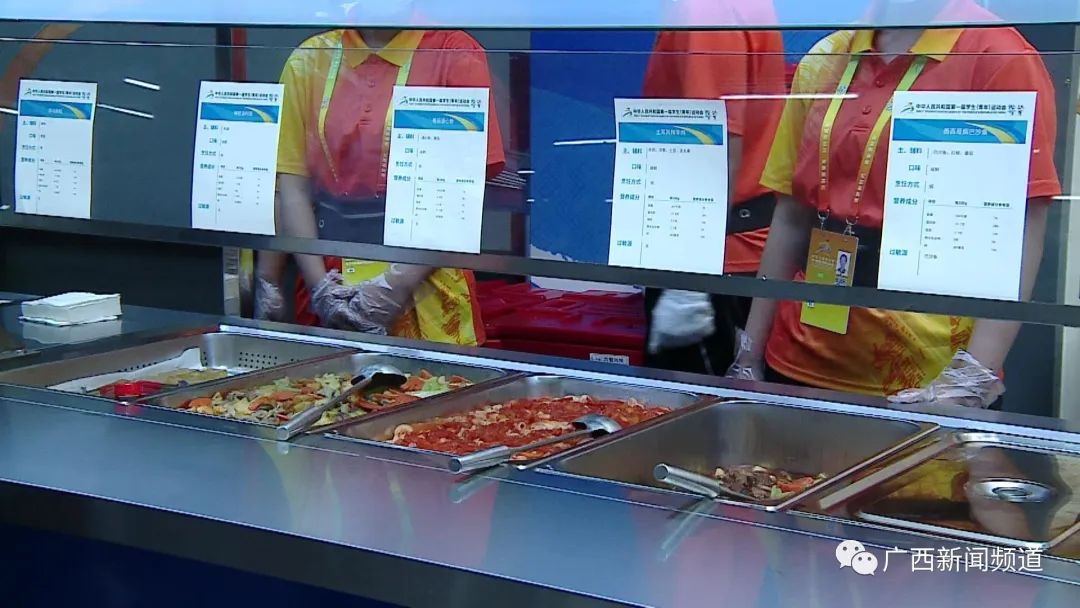 第一届全国学生(青年)运动会运动员村工作人员 侯晨宏:每道菜会有能量、蛋白质、脂肪、碳水化合物这些,包括盐,每道菜都有注明,因为有些菜品它是,比如说有过敏原什么之类的,这些写明了他们就清楚了。