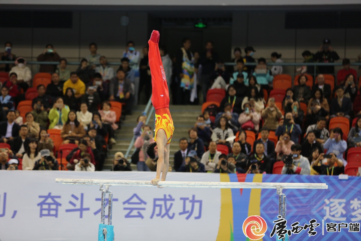 南宁队郑宝鑫在双杠项目比赛中。记者 卢惠敏 摄
