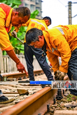 柳南转场线全长1.734公里,线路虽短,却是连接柳南二场至柳南五场的重要通道。因货车运送繁忙,线路设备承载压力大、钢轨磨耗程度大。为确保列车运行安全,11月23日,宁铁柳州工务段组织员工,对柳南二场至五场转场线进行了换轨施工。图为施工现场。 记者 黄远来 通讯员 覃文愿 赵波 摄(广西新闻网-南国今报)