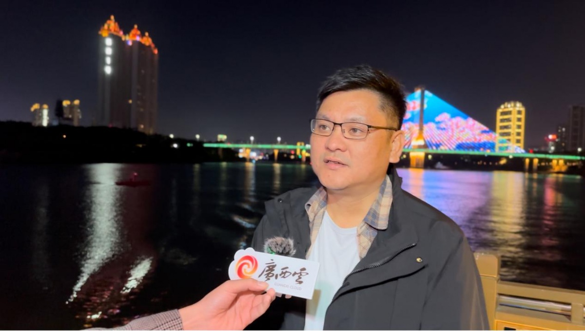 风团成员网络大V“斯图卡98”接受本地媒体采访。广西日报-广西云客户端 记者 林昱宏 摄 “凌铁大桥、葫芦鼎大桥真的是宏伟壮观,亭子码头的热闹喧嚣也让人忍不住想去一探究竟……邕州芳华真的让人心驰神往。”来自福州的微博达人“福州那些事儿”忍不住点赞道,“邕江两岸和跨江桥梁亮化工程让邕江这幅光影画卷璀璨夺目,短短一小时的瑰丽之旅让人印象深刻。” 据悉,邕江夜游是南宁市水上旅游项目之一,游船沿邕江顺流而下,畅游邕江大桥、古城墙、壮族神话浮雕、凌铁大桥等南宁地标建筑和景点,途经冬泳亭、洋关码头、雷经天故居、邓颖超纪念馆等南宁著名红色景点,追寻毛泽东、邓小平、孙中山、雷经天、陈勉恕等人革命足迹,一路东下,不仅能看大堤灯光秀,还有柳沙半岛建筑群、广西文化艺术中心以及青秀山风景区等充满代表性的南宁地标,将南宁的民族风情和秀美山河尽收眼底。 邕江夜游主题游船结合邕江沿岸生态景观资源,深入挖掘南宁文化底蕴,融入航线讲解和特色活动中,让市民和游客充分感受到本土文化魅力,也给市民和游客带来多元化体验。邕江夜游主题游船自运营以来,累计出航班次近1万航次,年均接待市民和游客10余万人次,累计接待市民和游客约60万人次。 微博达人“裕豪Life”表示,“在游船上,可以一边品味南宁特色美食,一边欣赏邕江两岸的夜色。观赏南宁的霓虹灯倒映在江面上,波光闪烁,让人感到灵动又浪漫。我今天会多拍一些邕江夜景的图片和视频,到时候上传到微博、抖音、百家号上与我的‘粉丝’进行分享。” 新“夜”态吸睛 打卡民生烟火夜肆 夜市千灯照碧云,高楼红袖客纷纷。网络名人们进入民生广场·水漾市集后马上开启了探营模式。“你看!这里有茉莉花味的手煮奶茶!”“哇,晚上竟然还有DJ和派对,太热闹了!”“这是南宁特色糕点吗?看起来很精致呢。”作为中国西南地区极具特色的大型东南亚风情市集,民生广场·水漾市集挖掘邕江水系民生广场地域及文化属性,将绿城、公园、邕江、码头等元素与东南亚风情有机融合,网络名人们在这里可以嗨吃嗨购嗨玩。
