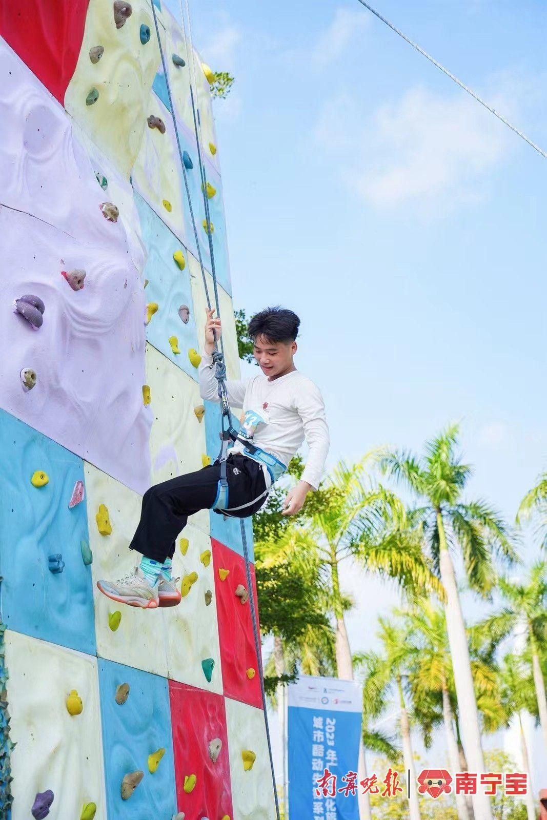 参赛选手挑战攀岩项目。记者 林显威 摄 南宁户外运动协会副秘书长李承恩表示,随着南宁市全民健身活动不断开展,越来越多涉及户外技能的运动项目被写入市民健身项目选项中。比如攀岩、铁人三项、桨板、绳索速降等项目都开展得比较火热。另外,百里秀美邕江建成后,每当天气宜人的周末,邕江两岸各地休闲公园里总能看到进行户外运动和休闲的市民,户外技能也逐渐被重视。“我们组织这样的比赛可以给南宁市热爱户外运动的健身爱好者搭建一个展示自我、挑战自我的平台。另外,我们也希望青少年通过参与比赛能够学习到更多的户外技能知识。同时也希望通过在邕江沿岸公园这样一个市民‘看得见’的地方办赛,让更多市民了解户外运动。”
