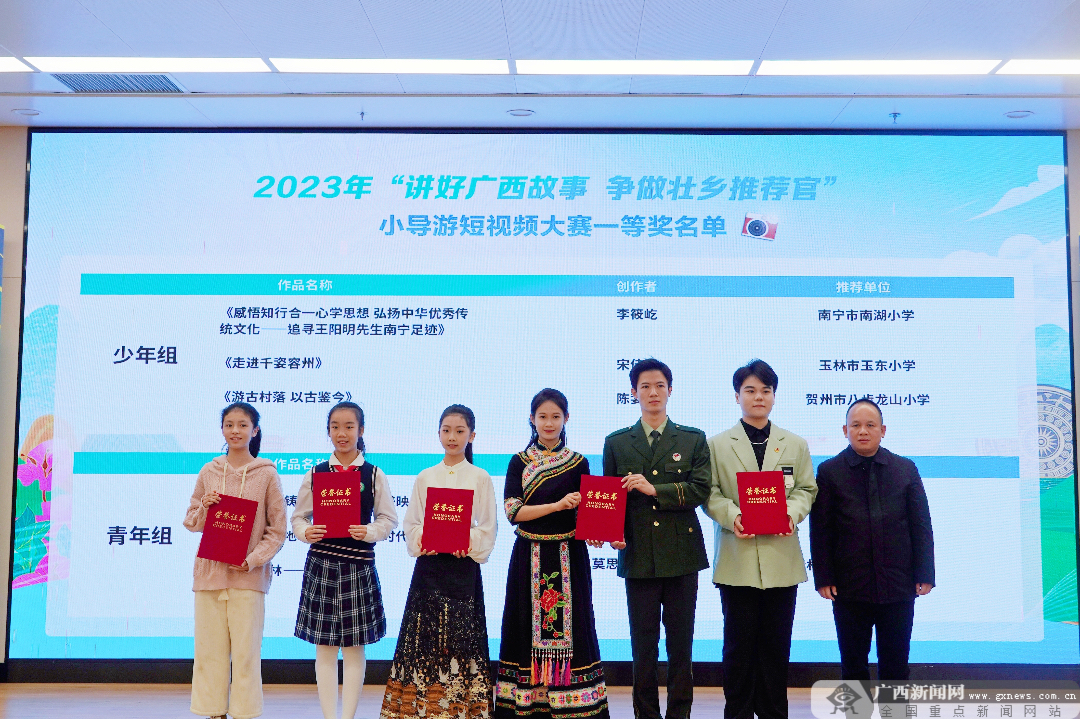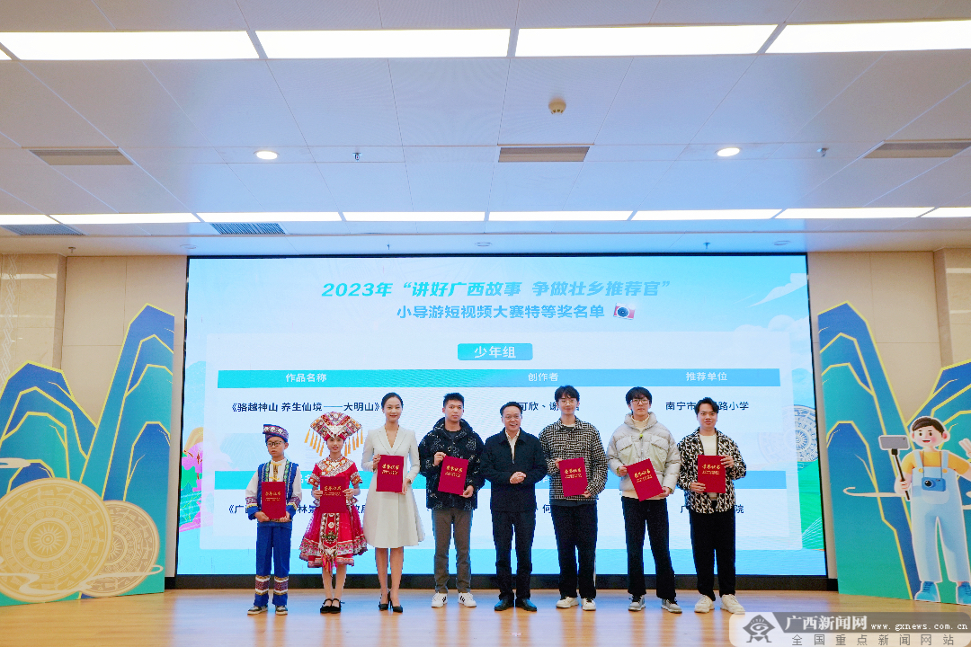 主办单位领导及相关处室负责人为获奖代表颁发证书,为获奖单位代表授牌并合影留念。记者 甘艳霞 摄 仪式上,青年组特等奖获奖作品《广西故事——林景云烈士故居》的创作者吴思奇,少年组特等奖获奖作品《骆越神山 养生仙境——大明山》的创作者覃可欣,以及青年组、少年组一等奖获奖代表蒙鑫美、徐礼强、李筱屹分别演绎获奖作品。他们现场化身广西“小导游”,带观众们走进大明山的神秘仙境,在群山环绕的养生仙境中探索文化底蕴;走访林景云烈士的故居,讲述一张张老照片、一个个老物件背后的那段红色传奇......