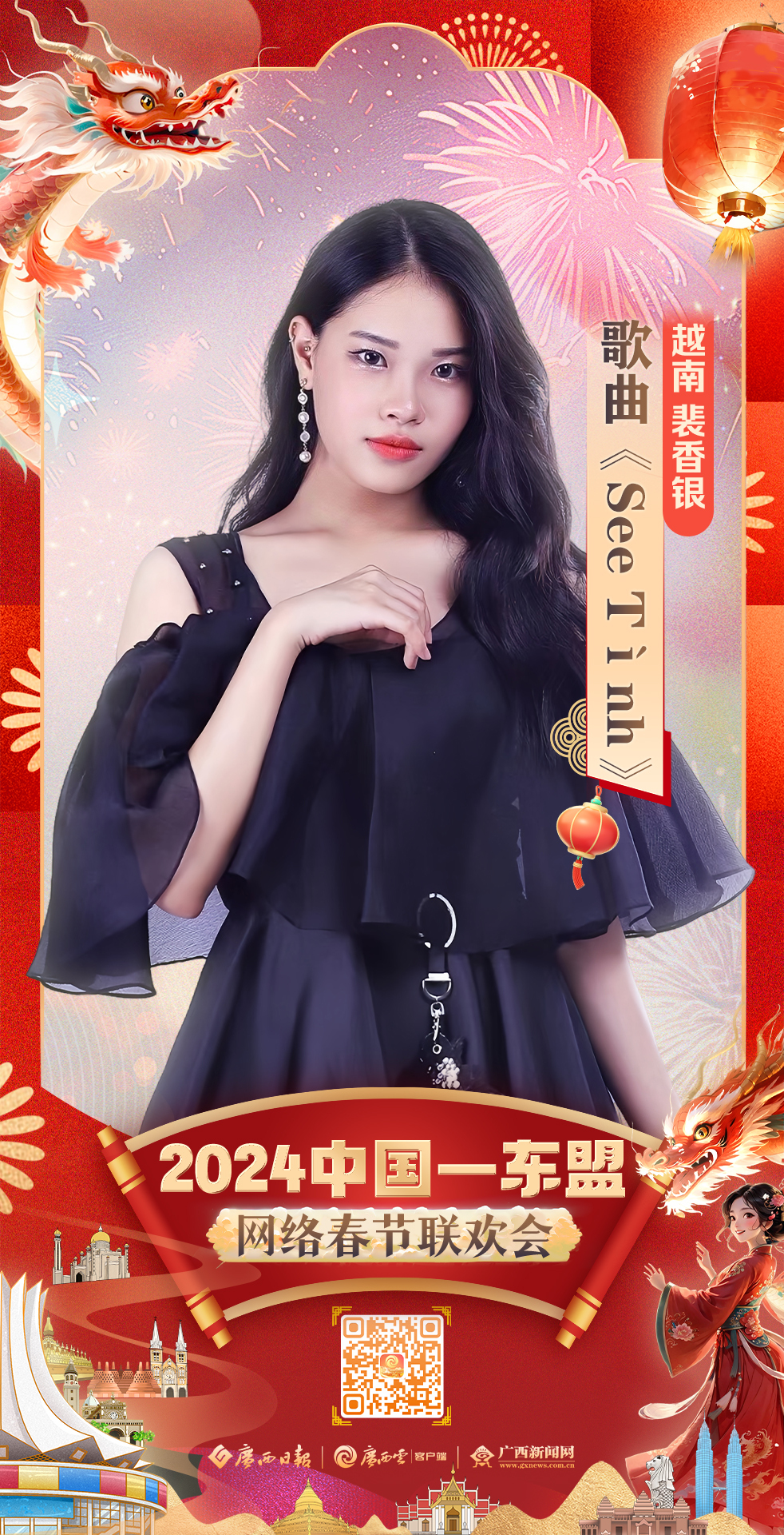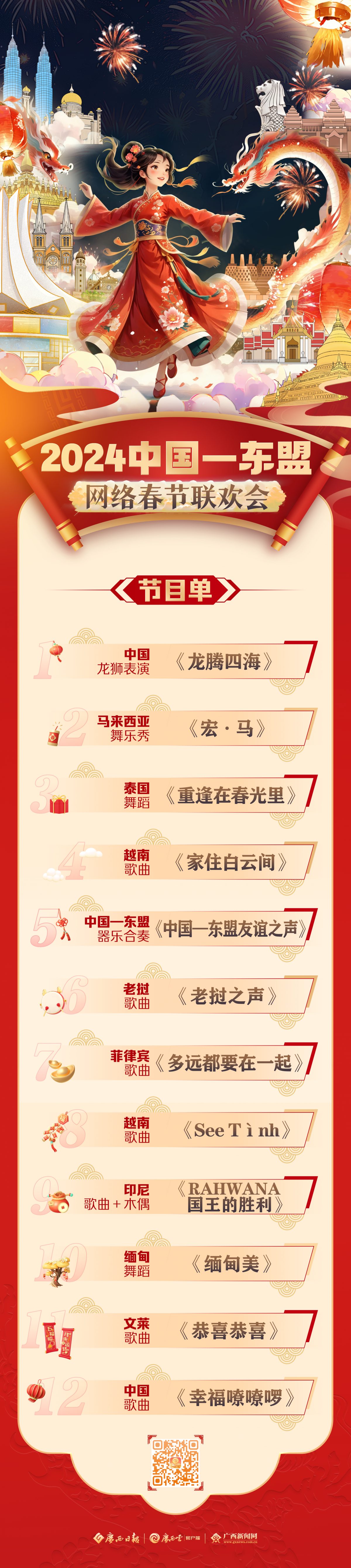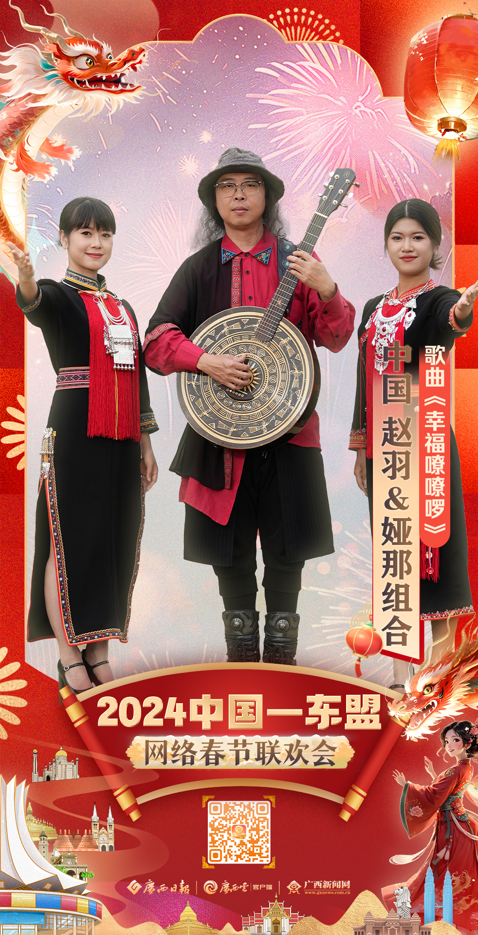 中国:赵羽&娅那组合 歌曲《幸福嘹嘹啰》 2024年2月8日 20:00 “跨越山海 焕新启航” 2024中国—东盟网络春节联欢会 即将“龙”重登场 更多惊喜,敬请期待!