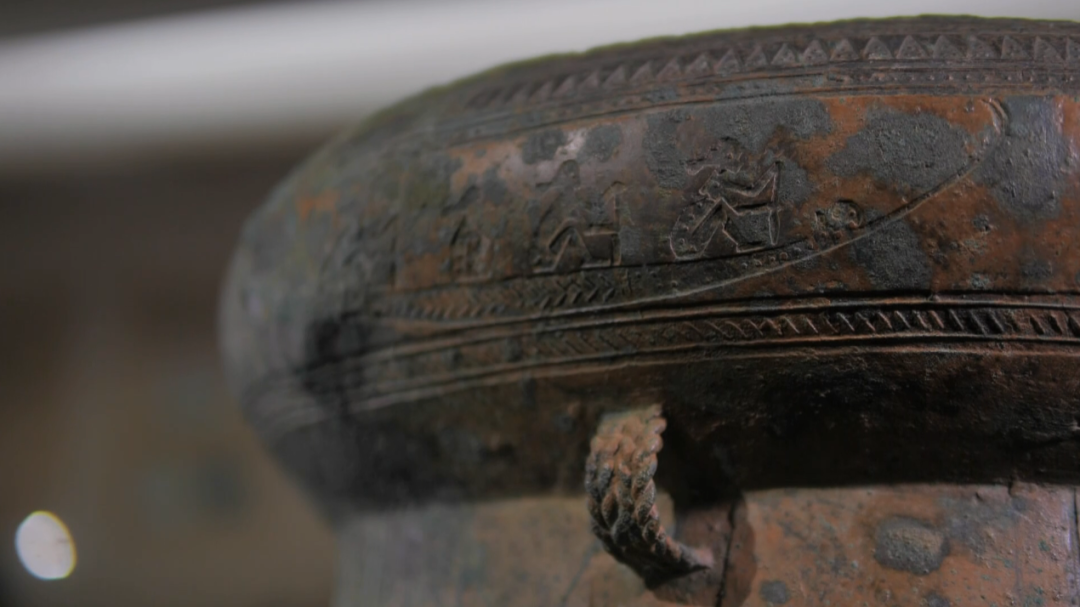 来自贺州龙中岩洞葬的一面铜鼓,鼓胸上铭刻着一幅竞渡的图案,四个断发纹身的越人正在奋力划桨,这正是百越民族“竞渡”习俗的体现。专家推断,这面铜鼓的铸造年代,不会晚于战国晚期。