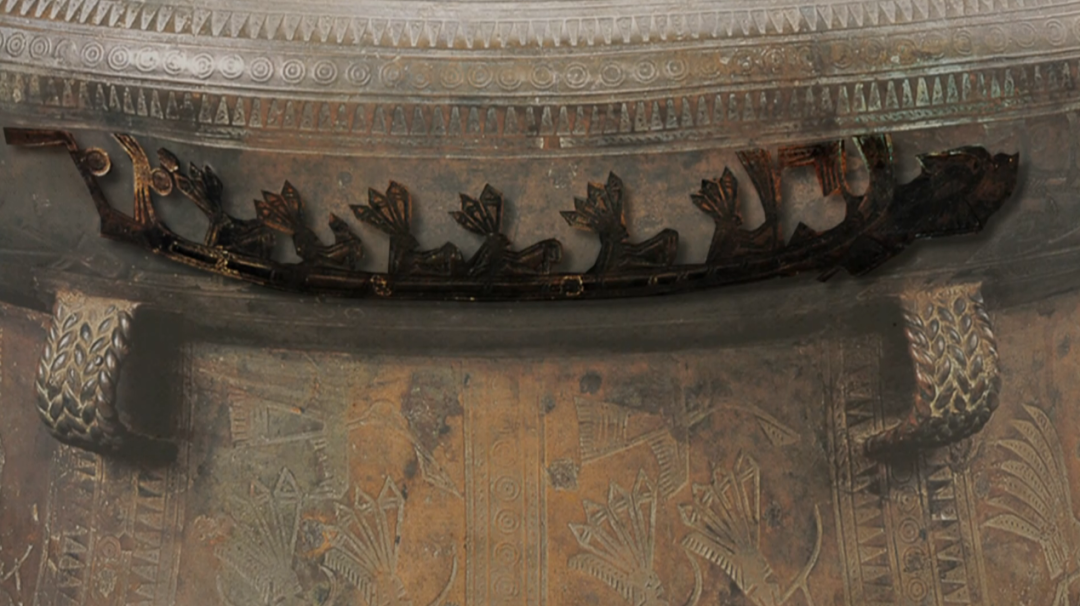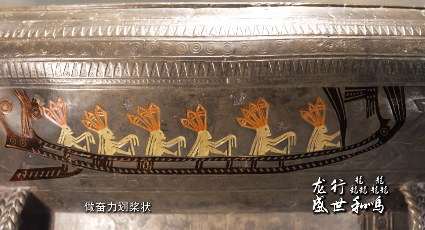 每个船上有化装羽人6人,大多头戴高大的令箭状羽冠,做奋力划桨状,腰部八组人物头戴羽冠,身穿吊裙,两臂外展,双腿叉开作舞蹈状,展现了一幅生动的羽人竞渡的场景。