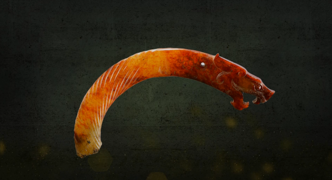 罗泊湾2号墓出土的玉饰件,一端雕琢龙首,龙作昂首张嘴状,颈部刻细鱼鳞纹,身刻绞丝纹。纹饰刻画极为细浅、流畅自如,精巧而不失灵性。这些都是西汉龙形的典型代表。