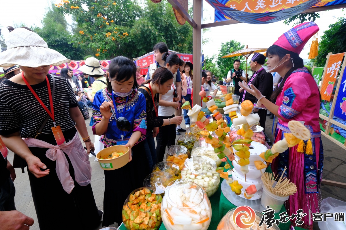游客学习打油茶技艺。 进入南宁青秀山风景区,记者来到“美味广西”村寨,只见道路两旁整齐有序地排列着各类美食摊位,摊位前挤满了游客,工作人员麻利地为过往游客递上做好的食物,一旁的师傅则忙着继续制作食物。据了解,“美味广西”非遗村寨,汇聚了广西多地非遗美食,有大菜也有小吃,游客在这里能吃遍广西非遗美食。摊位上还有投票箱,游客可以为自己心仪的美食投上一票。 广西酸嘢成为外地游客必尝的美食。