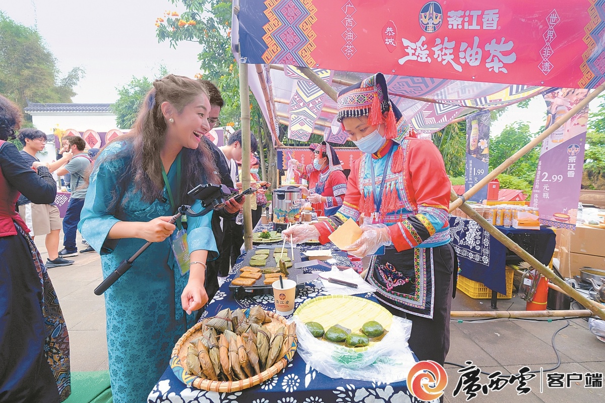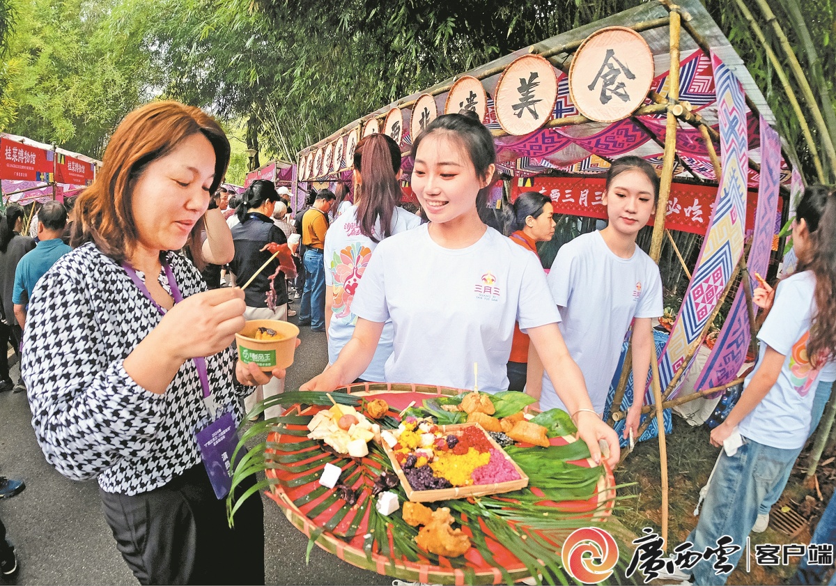 各种广西特色美食吸引游客驻足品尝。 “早就听说广西的酸嘢好吃,这次终于吃上了!”来自吉林的许女士兴奋地告诉记者,此前她在网上经常看到酸嘢的宣传视频,一直很想品尝,得知三月三是广西的大活动,她特地休假过来感受活动氛围。除了酸嘢,她还品尝了油茶、老友粉、炒螺等美食,并购买了包装好的五色糯米饭、广西特色药材汤包等,计划带回吉林全家一起品尝。“大饱口福,不虚此行!”许女士向记者表示。