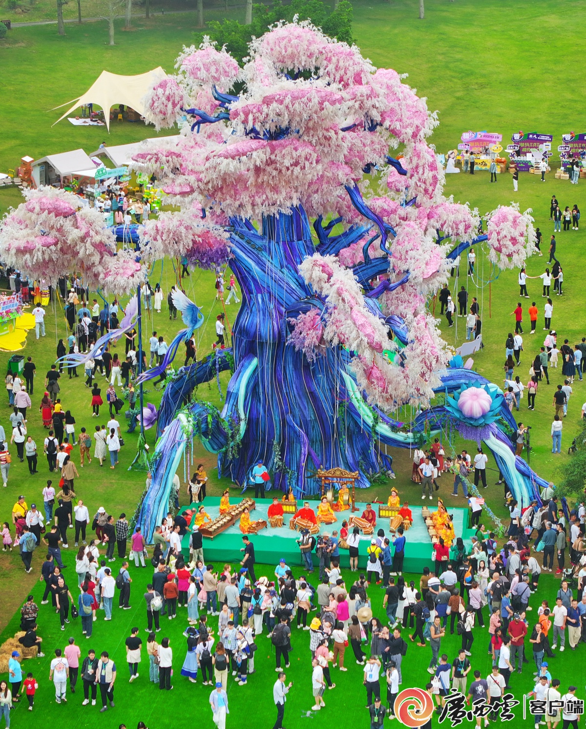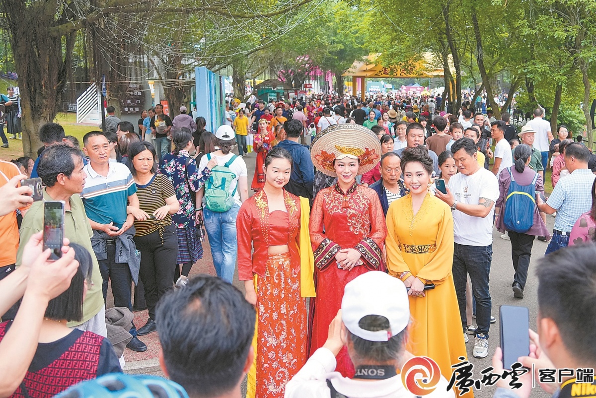 东盟国家学子与游客热情互动。 今年是中国—东盟人文交流年,音乐和艺术的交流成为中国和东盟各国生生不息的精神纽带。来自印度尼西亚的仁迪带领甘美兰乐团来广西赶歌圩,架起印尼与广西人文交流的桥梁。以歌会友、以歌待客,随着“广西科目三”的音乐响起,现场气氛瞬间被点燃,表演者和中外游客情不自禁地加入这场盛大的歌圩,现场成为欢乐的海洋。