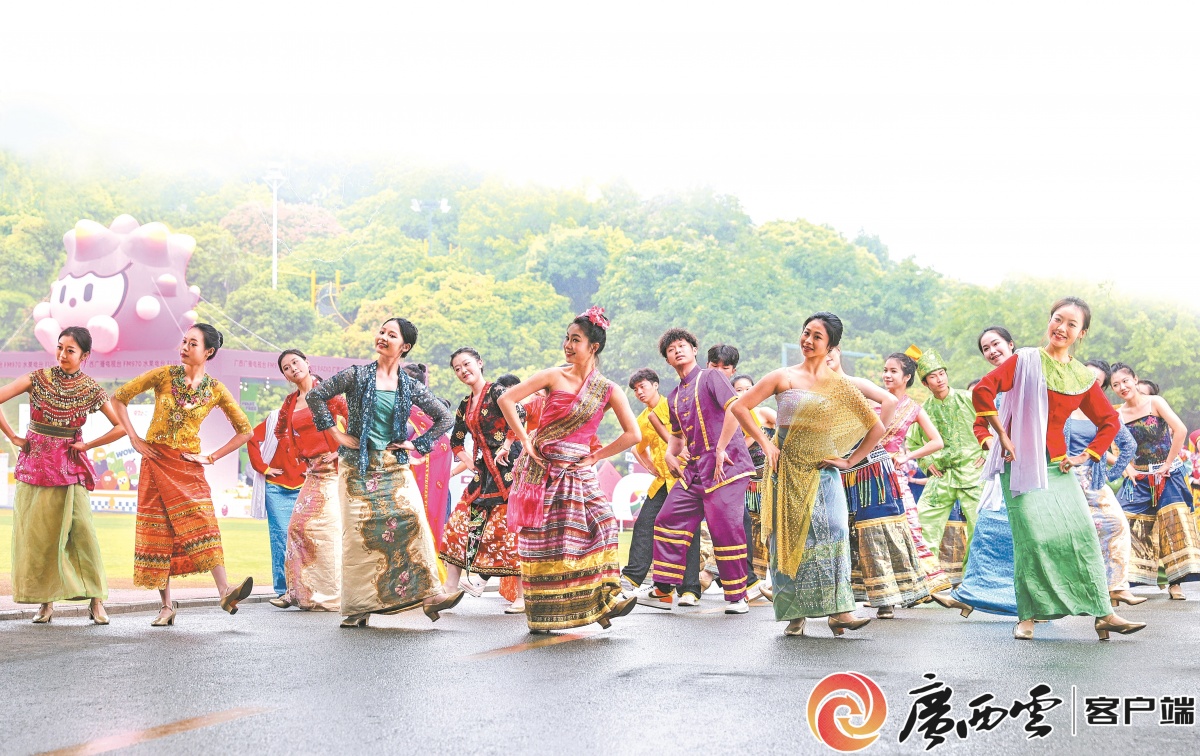精彩的东盟国家传统歌舞展演。刘峥 摄 活动现场还集中展示了中欧班列集装箱和模型、东盟国家的特色水果等,从不同侧面展现了广西积极服务和融入新发展格局,以高水平对外开放推动高质量发展的生动实践。