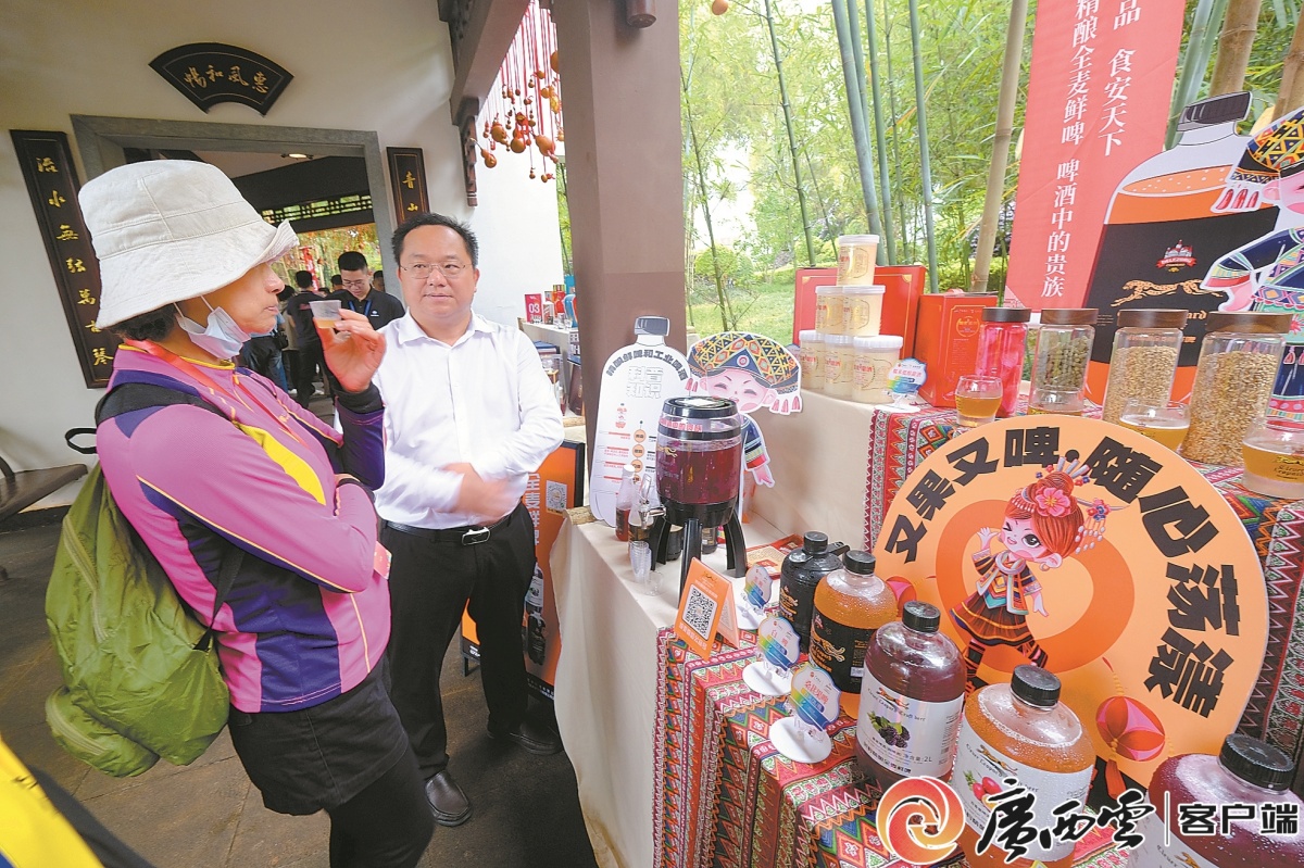 品尝广西特色果酒。 这些“桂字号”产品展现了广西好山好水出好物的良好形象,让游客感受到了“广西产”的无限魅力。“这是我第一次参加广西三月三,没想到广西有这么多好东西!”来自北京的梁女士告诉记者,她在主会场大包小包买了不少,打算带回北京与亲朋好友分享。
