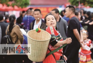 4月11日,正值农历三月初三,柳州各地举办了形式多样的活动,欢庆“三月三”,乐享民族文化盛宴。图为融安县板榄镇,一名女子在参加“接绣球”游戏。通讯员 谭凯兴 摄(广西新闻网-南国今报)