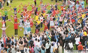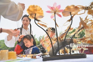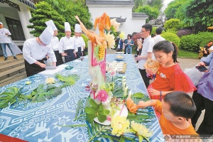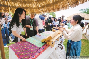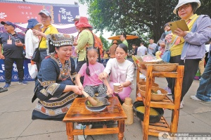 4月11日,在2024年“广西三月三·八桂嘉年华”文化旅游品牌活动主会场,“美味广西”村寨正在进行一场广西美食盛宴,各美食摊位香飘四溢,吸引诸多游客驻足品尝。图为游客学习打油茶技艺。记者 周军 梁凯昌 徐天保 王希 摄(广西新闻网-广西日报)