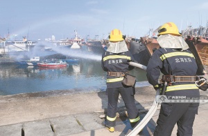 5月13日,北海市海城区消防救援大队消防员在地角内港进行消防演练。今年伏季休渔期,该港停泊渔船500余艘,北海市严格落实休渔制度,做到船进港、网封存、人上岸,全力筑牢安全防线。李君光 摄(广西新闻网-广西日报)
