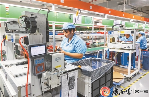 三诺跨境电子深加工产业示范园是广西自贸试验区崇左片区“两地双园”重点项目和打造“走出去”的重要平台。图为工人在产业示范园加工耳机。 刘峥 摄