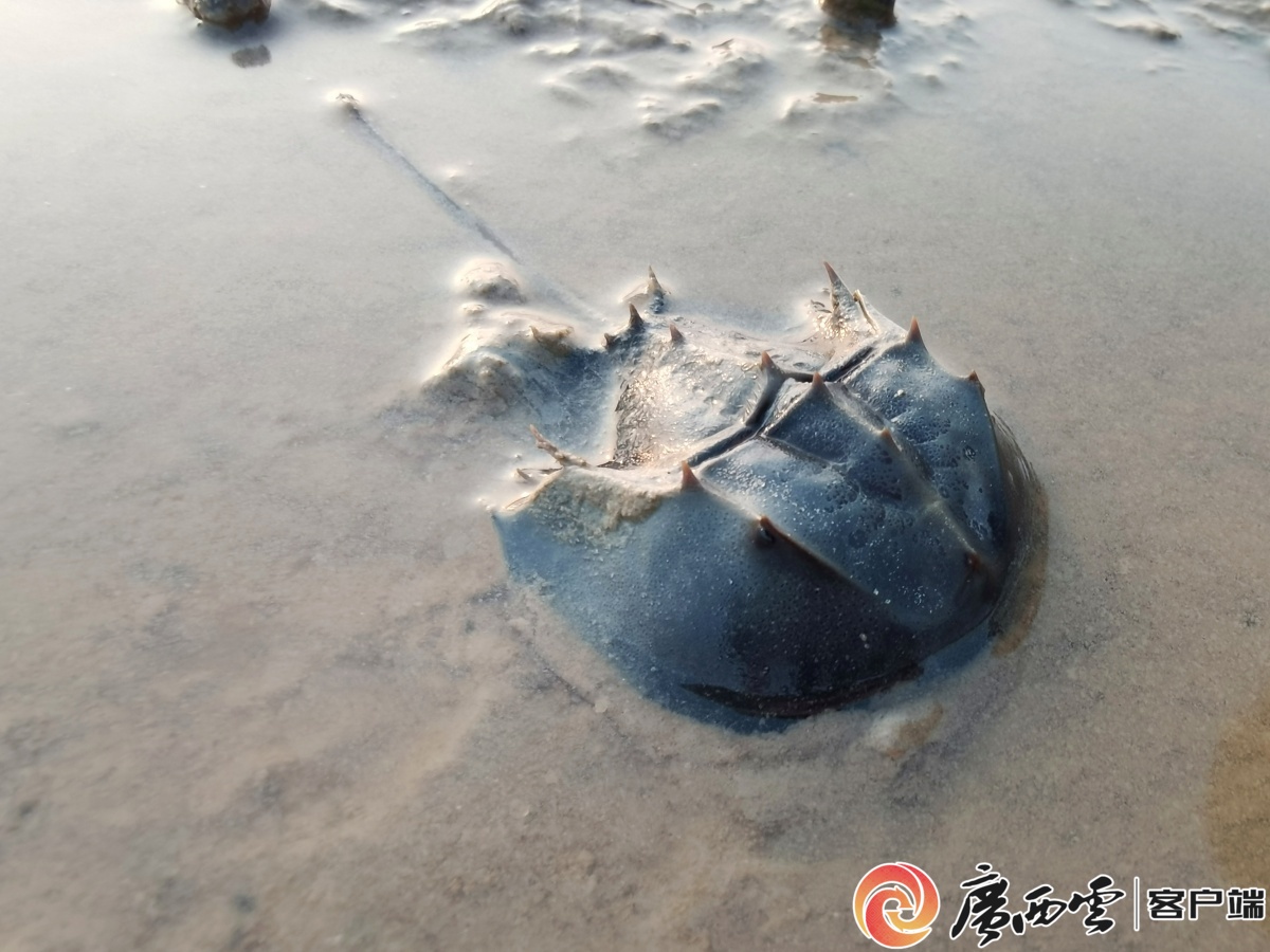 6月30日,广西合浦儒艮国家级自然保护区榕根山滩涂,一个头戴草帽的中年人弯着腰,在沙水中寻找着什么。突然,他蹲下来,挖出一个小小生物,平放于掌上,高兴地说:“看,这是我们6月16日放流的幼鲎,已经脱了一次壳。”