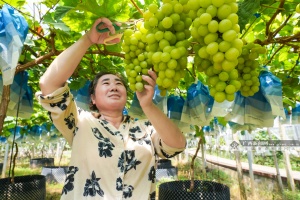 近日,在全州县才湾镇毛竹山村,村民在采摘葡萄供应市场。近年来,该村大力发展兰玉、阳光玫瑰、科美、春光、妮娜皇后等优质葡萄种植,成为村民增收致富的支柱产业。唐广东 摄(广西云-广西日报)