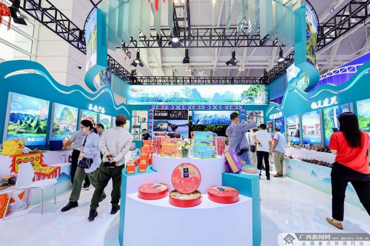 “壮美广西”主题展示区。广西壮族自治区文化和旅游厅供图 在文旅产品展示区,共有35家广西知名文旅企业参展。根据京津冀游客的购买爱好,参展企业精心选取柳州螺蛳粉、玉林牛巴、北海珍珠等备受欢迎的非遗衍生品、特色文创、地方特产等旅游商品进行展销。这些产品不仅代表了广西的独特文化和风味,也满足了游客对纪念品和伴手礼的需求。