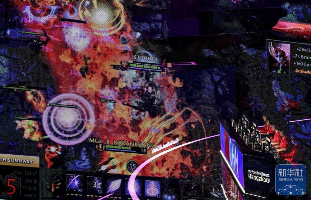 ↑2023年10月2日,中国队选手在比赛中(多重曝光照片)。当日,在杭州亚运会电子竞技项目刀塔决赛中,中国队以2比1战胜蒙古国队,获得冠军。新华社记者 颜麟蕴 摄