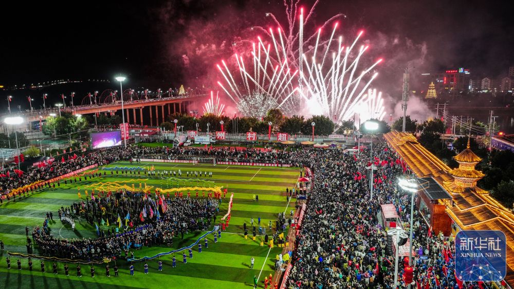 ↑2024年2月3日,音乐烟花秀在“村晚”上演(无人机照片)。当日,2024全国“村晚”示范展示活动暨贵州“村超村晚”在贵州省黔东南苗族侗族自治州榕江县拉开帷幕。活动包括“村超村晚”文艺展示、2024龙年“村超”贺岁战等内容。新华社记者 刘续 摄