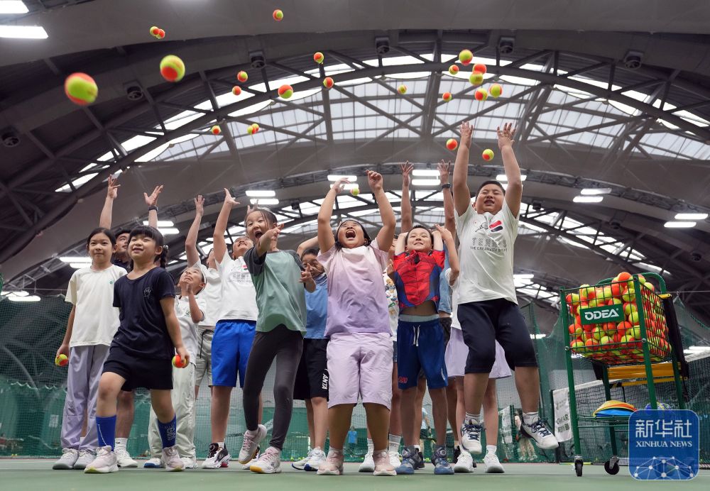 ↑2024年8月14日,在北京一家网球俱乐部,小学员在结束网球暑期夏令营的课程后合影。新华社记者 才扬 摄