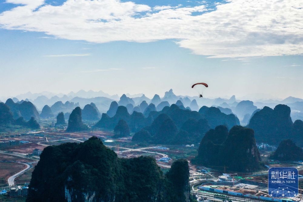 ↑游客在广西桂林市阳朔县体验动力滑翔伞(2019年11月14日摄,无人机照片)。新华社记者 曹祎铭 摄