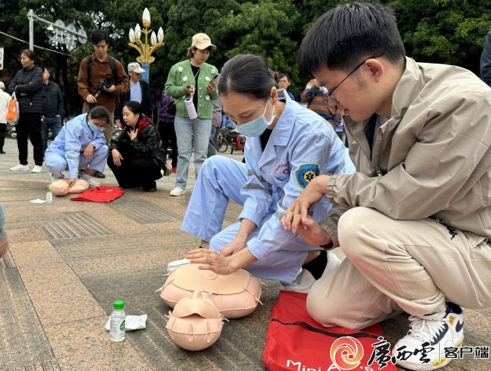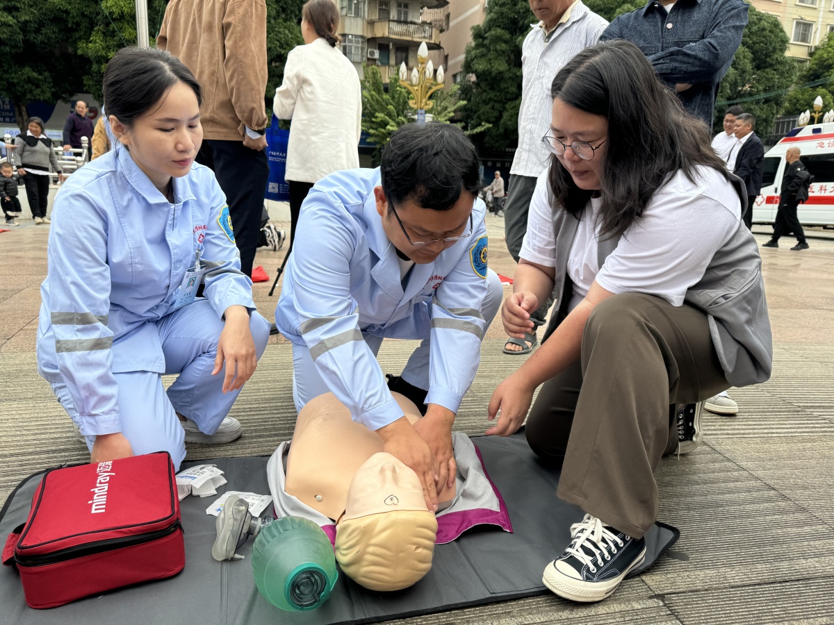 活动现场开展大型社会急救员培训,培训内容包括心肺复苏(CPR)和AED使用的理论知识与实操流程,市民踊跃学习急救技能。