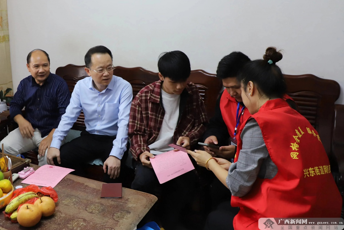 广西新闻网南宁11月7日讯(通讯员 黄喆玉)按照国家统计局统一部署,2024年广西人口变动情况抽样调查入户登记工作于11月1日全面启动。连日来,自治区统计局组织全区各级统计机构贯彻落实自治区党委、政府关于统计优质服务的有关部署,深入基层和调查现场,指导入户登记工作,全面提高源头数据质量。 11月5日,家住南宁市兴宁区金禾湾小区的李先生接待了几位特殊的“来访者”——自治区统计局党组书记、局长李盛一行和兴东社区人口调查员一道来到他家,开展人口变动情况抽样调查入户登记及调查指导工作。 “您家里住着几口人?”“家里有没有老人和儿童?”……在李先生回答的同时,兴东社区调查员邓子昌、薛丽快速地在手机中的人口调查专用采集程序上录入登记。