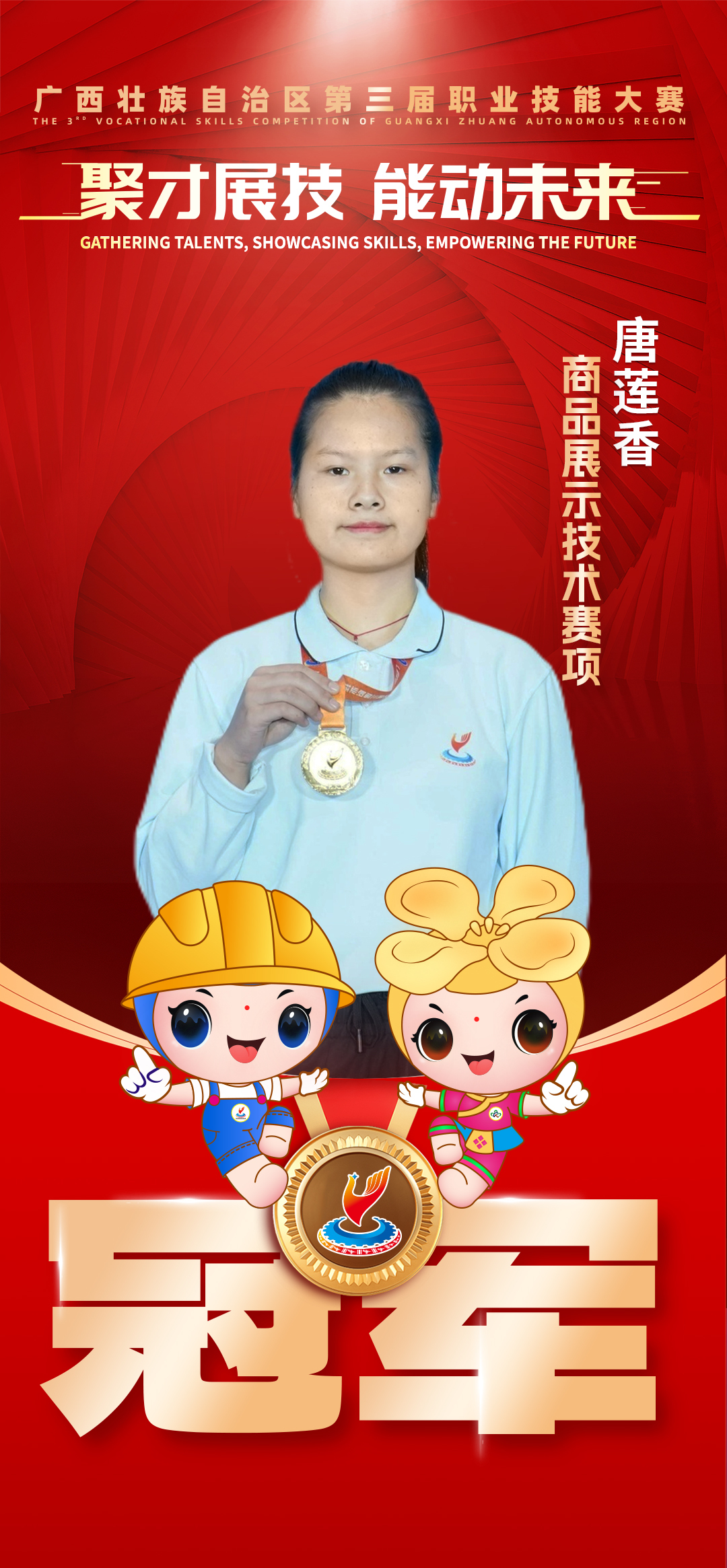 商品展示技术赛项冠军唐莲香。 (本文图片来源:广西壮族自治区人力资源和社会保障厅、广西云-广西日报) |