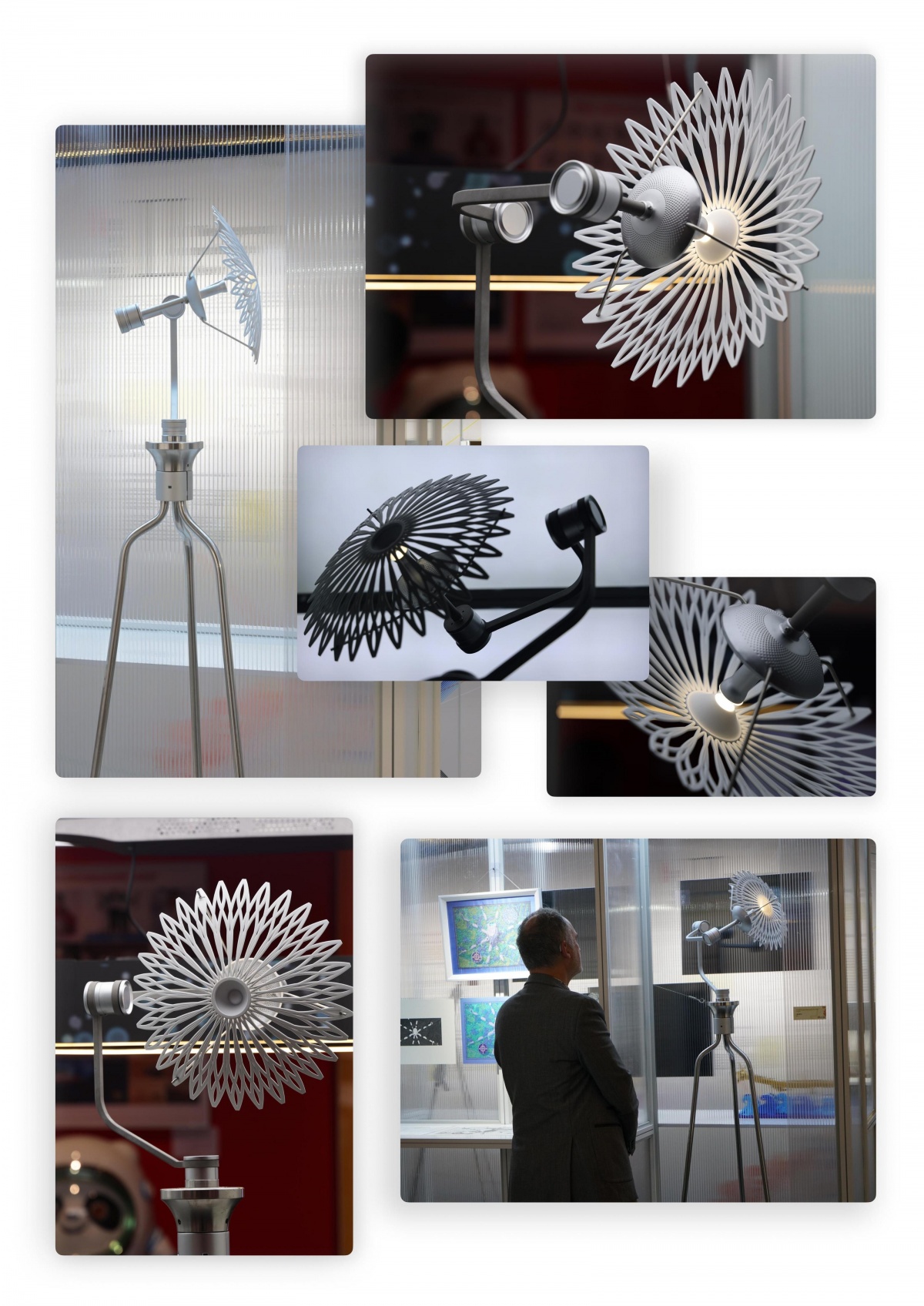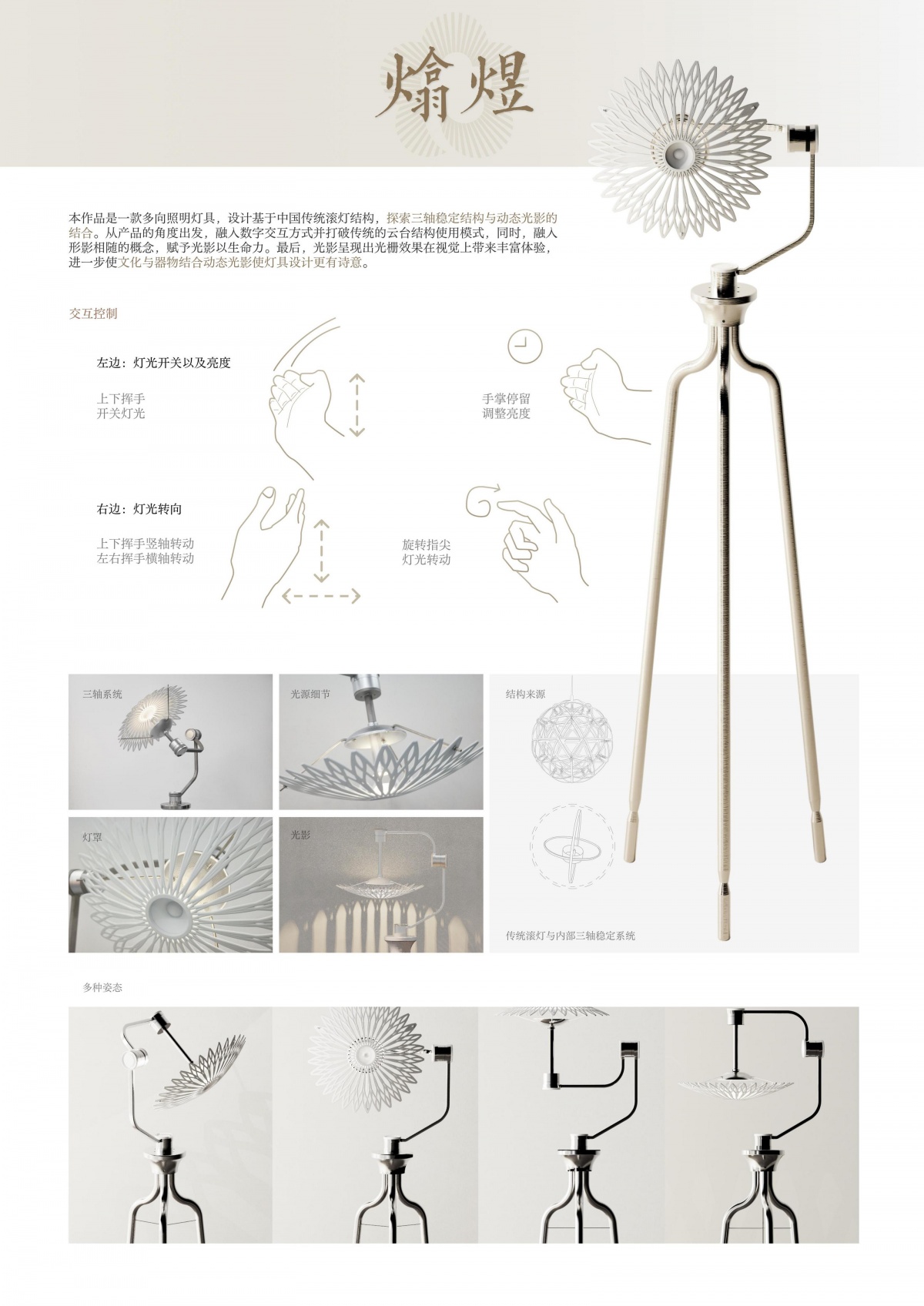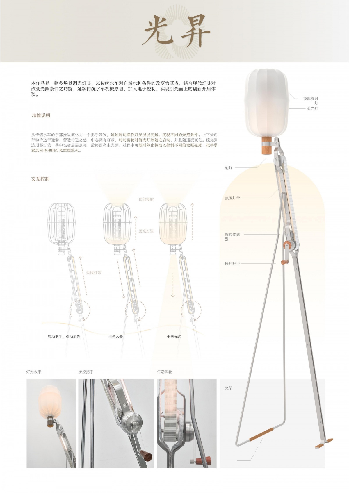 “上了大学后,身边充满‘脑洞’的同学,通过他们的创意把传统文化转化成有趣的文创生活用品,这个时候我就想,或许我也可以试试。”2023年,吴冬玥跟着南京艺术学院工业设计学院院长张明,与团队合力创作的《光昇·熻煜——中国造物文化现代转译研究系列灯具》斩获江苏省第十届“紫金奖”金奖。 这个作品很有意思,吴冬玥把传统水车作为创意灵感,创新设计了造型独特的一款落地灯。吴冬玥说,传统水车内含杠杆、齿轮、绳带等基本机械结构,“光昇”这款落地灯通过延续传统水车的机械原理,将电子传感器介入其中,实现了引光而上的美妙灯光互动体验。