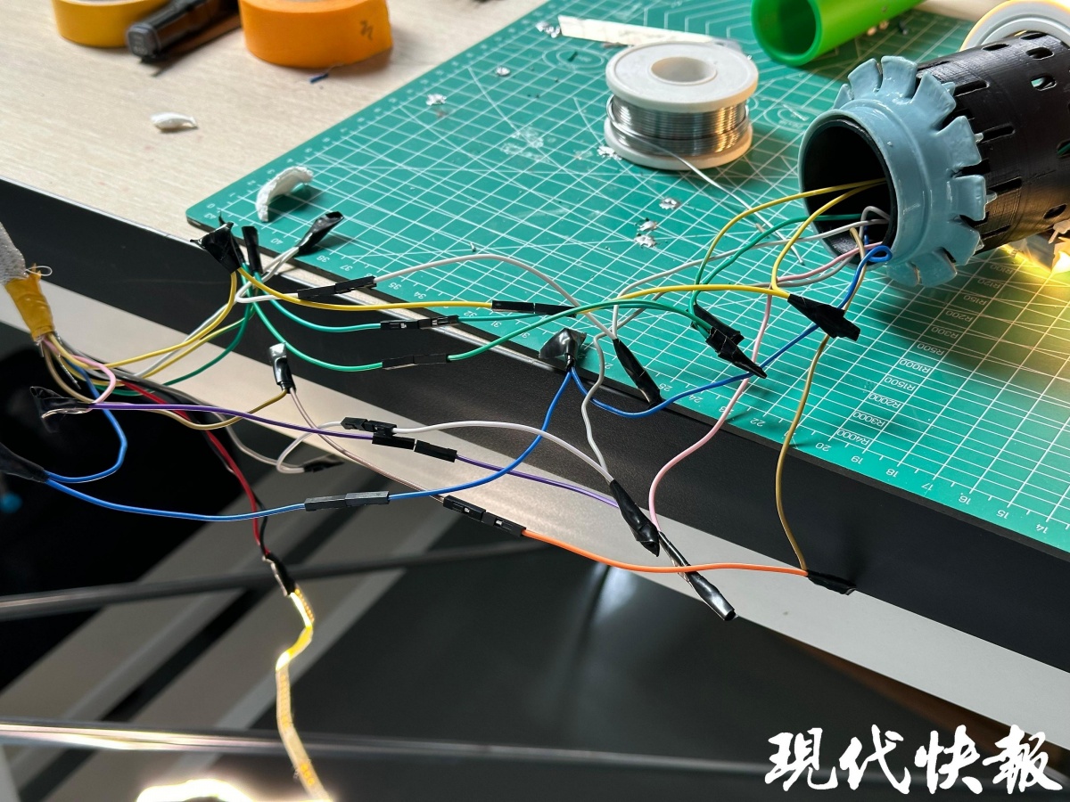 落地灯作者制作过程 另一款落地灯则是取材中国传统非遗滚灯,光与火的轮转,向阳而生的造型,由吴冬玥的同学袁艺玮、张可妍与导师张明以及老师黄亦佳、朱文翰、徐博文共同完成。“来自劳动人民的造物智慧与中国传统设计思维深深地打动了我,设计的过程也是成长与进步的过程。”吴冬玥说。