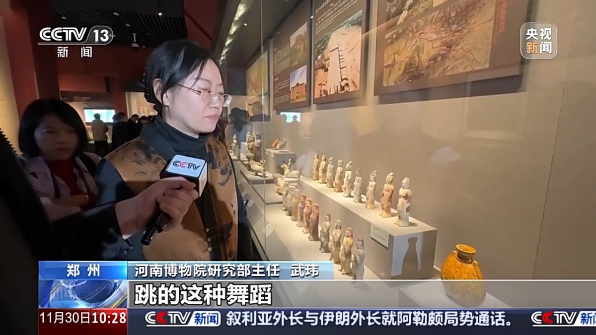 河南博物院研究部主任 武玮:乐舞者的形象高鼻深目,戴有一种翻帽,穿的是那种圆领或者是翻领的长袍。当时的人称为胡人的形象,跳的这种舞蹈,包括使用的乐器,可能最主要是来自中亚。