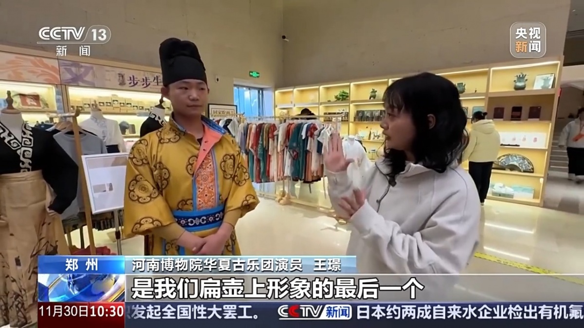 河南博物院华夏古乐团演员 王璟:我们也是依据一些文献记载,比如说我们有一个动作是提臀动胯,是当时的一个胡人的舞蹈形象。还有扬眉动目是我们扁壶上形象的最后一个。