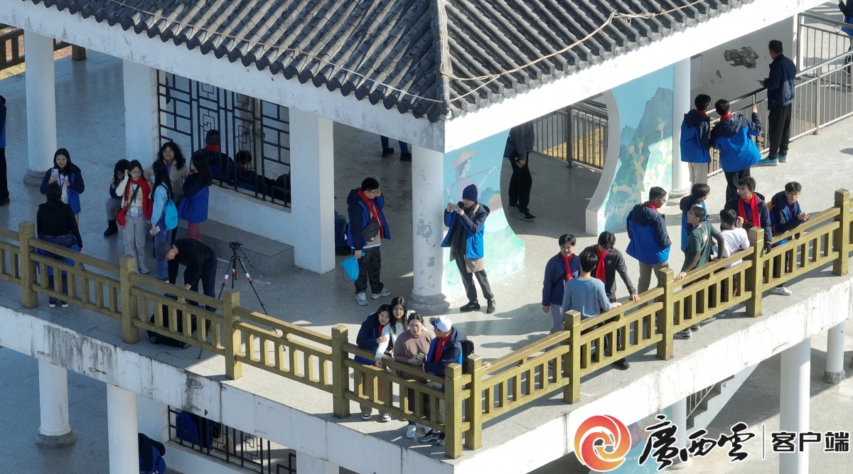 学生们在观景台欣赏侨乡风景。