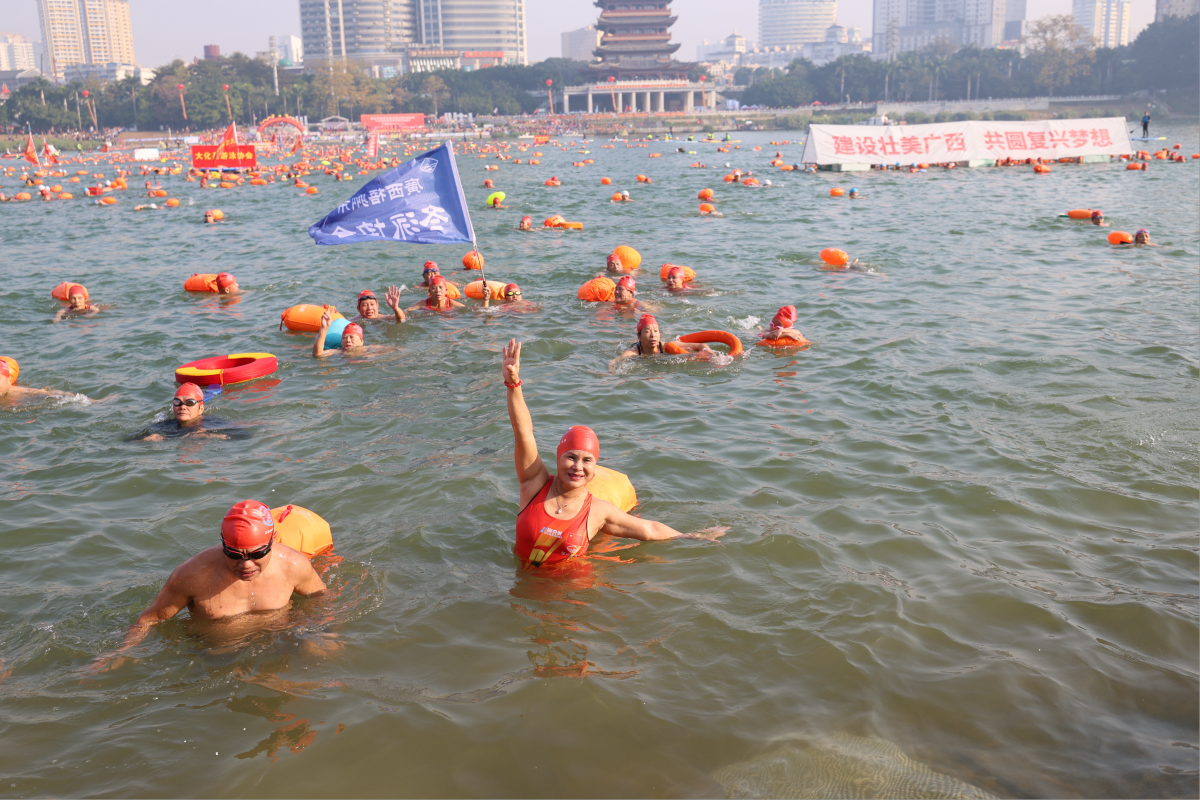今年活动由南宁市体育局、南宁市体育总会主办,共有64支队伍的3000名群众报名参加,除了南宁各单位、民间团体,百色、贵港、河池、玉林、钦州、崇左等区内城市也纷纷组队前来,其中还包括江西、上海、广州的百余名游泳爱好者。参与者中年龄最小的8岁,最大的79岁。