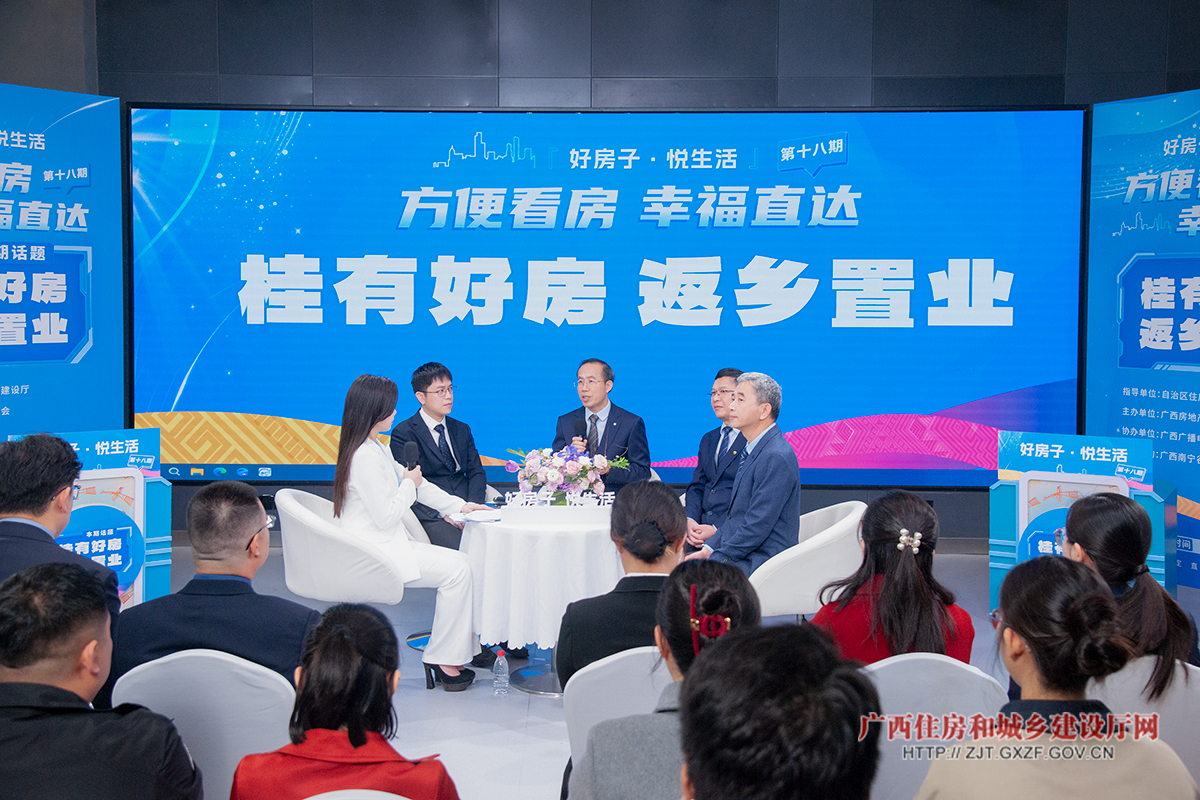 活动中,自治区住房城乡建设厅住房保障处、广西房地产业协会、金融机构和房地产企业有关负责人,分别介绍了广西返乡置业大行动各地市开展情况、2025年住房促消费工作安排、金融机构在返乡置业方面提供的信贷支持、房地产企业对市场的信心和拿地情况等,并回答了观众提问的城中村改造和住房补贴有关问题。